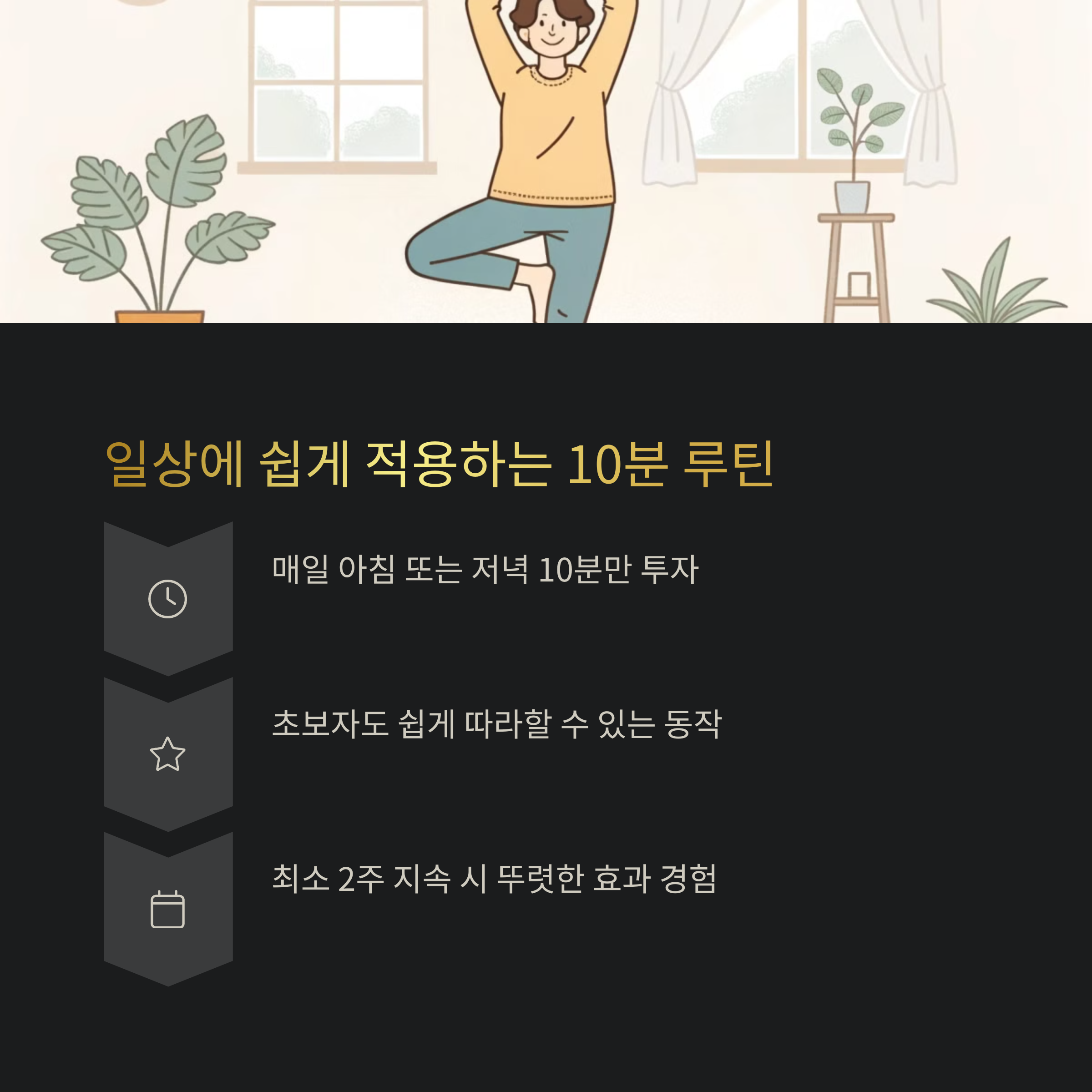 특히 10분 루틴은 짧지만 핵심 동작들로 구성되어 있어, 바쁜 일상에서도 실천이 가능하고 반복할수록 효과가 누적됩니다. 단기적 피로 회복을 넘어서 장기적 스트레스 저항력을 높이는 데에도 요가의 역할은 매우 큽니다.