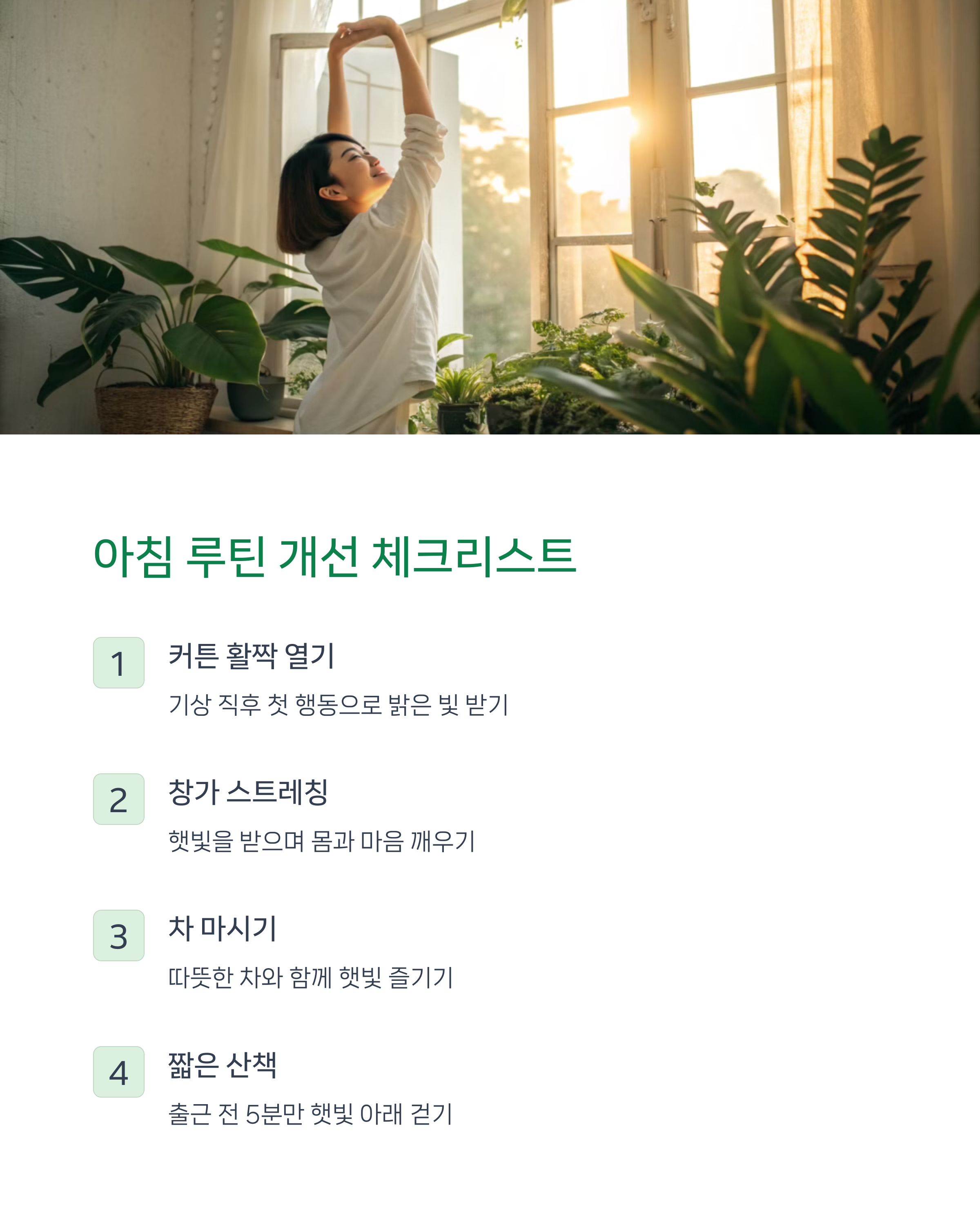 비가 오거나 너무 추운 날엔 실내에서 햇빛을 받는 것도 방법이에요. 저는 창문 가까이에 앉아서 커피를 마시거나, 간단한 스트레칭을 하면서 아침을 시작하곤 했어요. 유리창을 통해 들어오는 햇빛도 충분히 도움이 되더라고요.