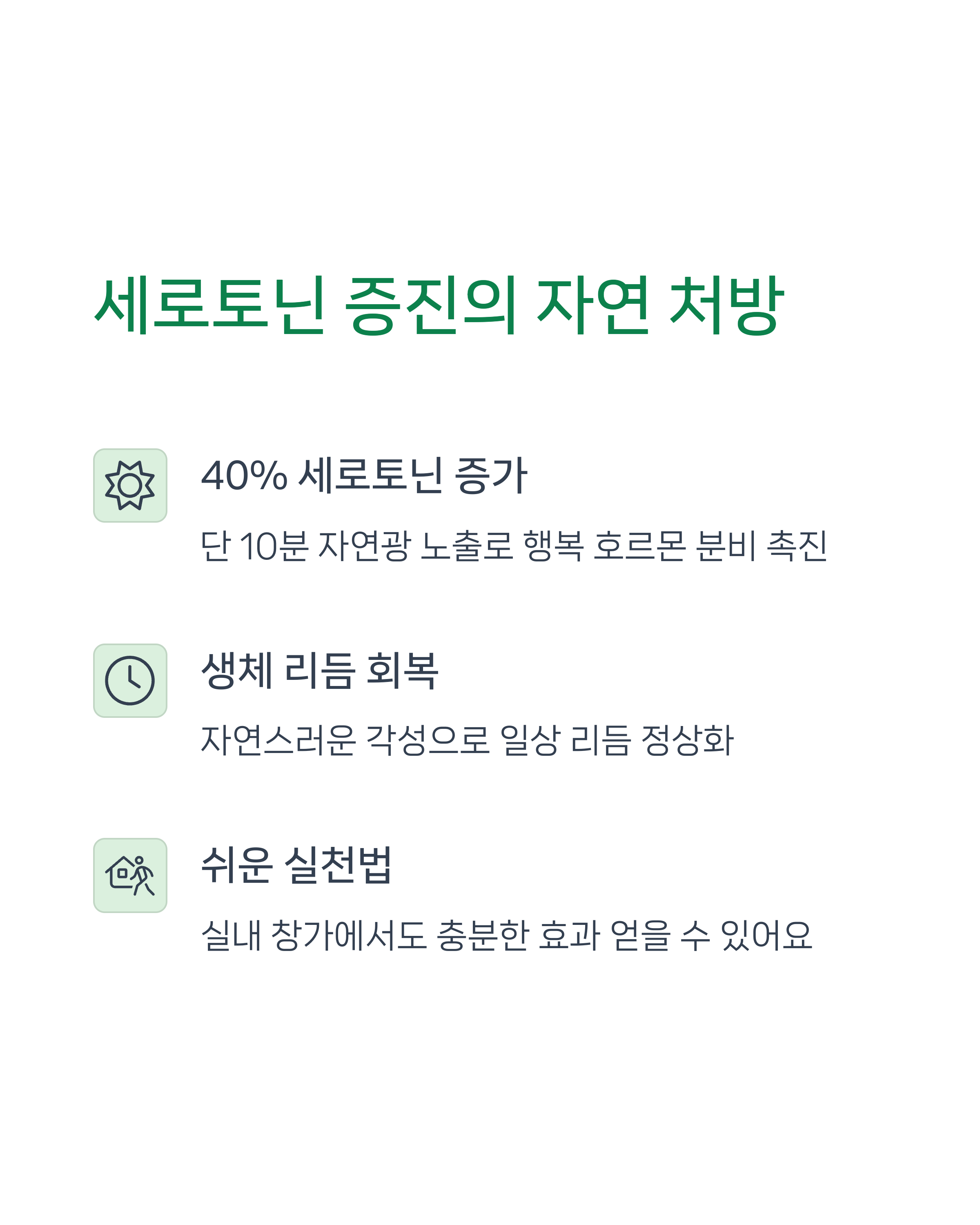 출근길에 잠깐 걸으면서 햇빛을 받거나, 점심시간에 야외 산책을 하세요. 시간은 짧아도 자주 접촉하는 것이 중요합니다.