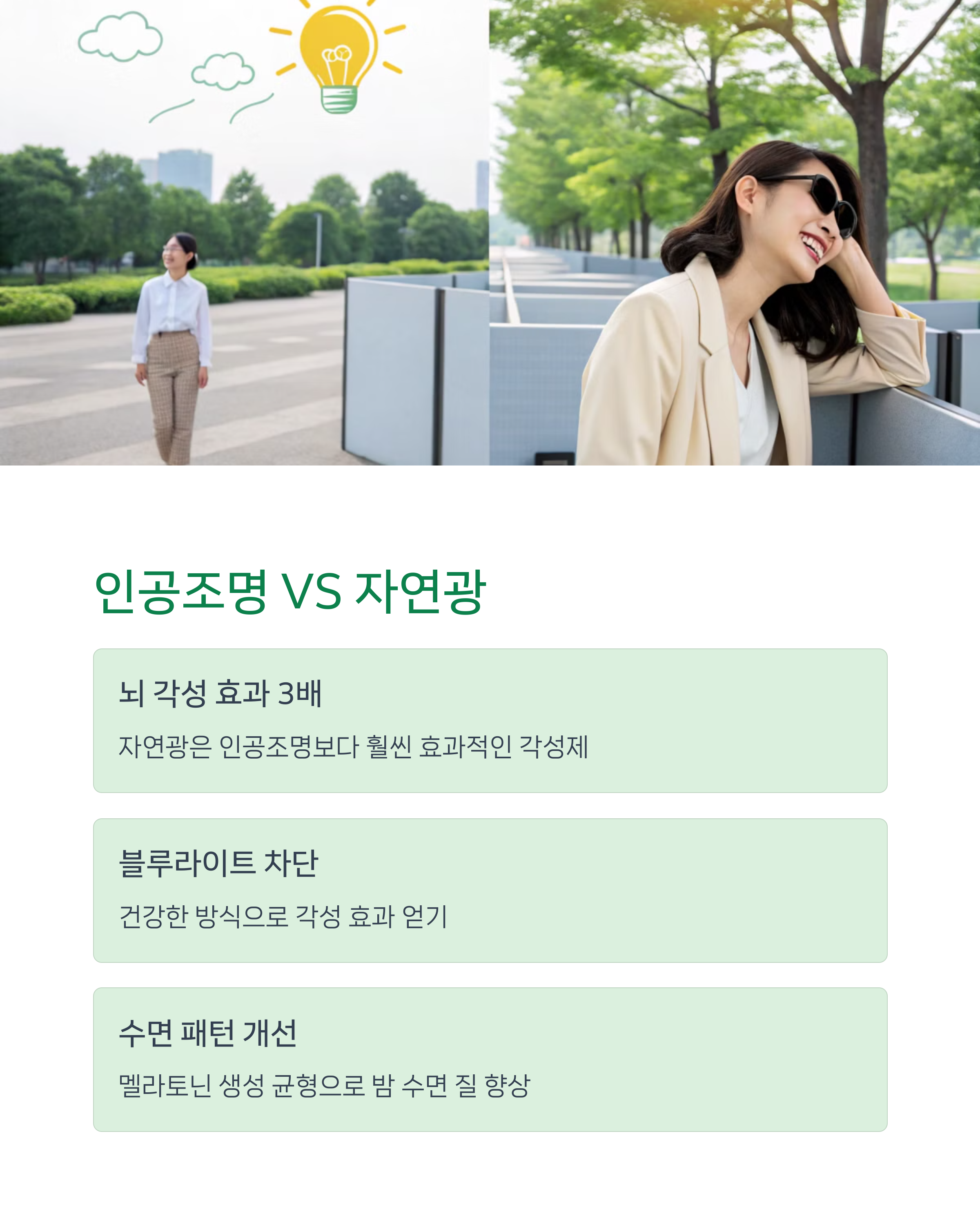 출근길에 잠깐 걸으면서 햇빛을 받거나, 점심시간에 야외 산책을 하세요. 시간은 짧아도 자주 접촉하는 것이 중요합니다.