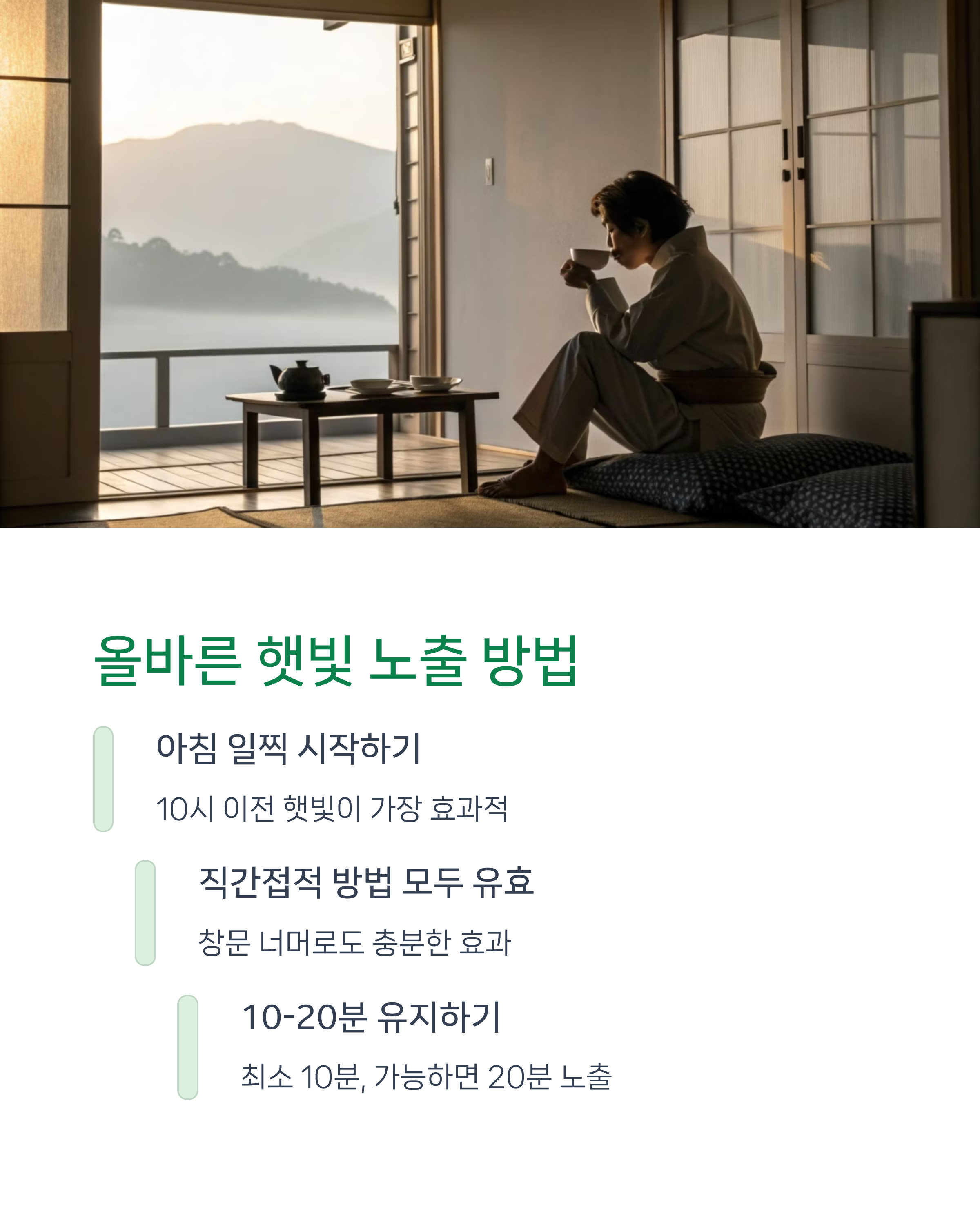사람마다 다르겠지만, 저는 아침 7시에서 8시 사이에 가장 효과를 많이 느꼈어요. 그 시간대의 햇빛은 눈부시지 않으면서도 충분히 밝아서, 몸이 자연스럽게 ‘이제 깨어날 시간이야’라고 말하는 듯한 느낌이 들거든요. 실제로 과학적으로도 이 시간대의 자연광이 멜라토닌 억제를 도와서 생체 리듬을 리셋하는 데 도움이 된다고 하더라고요.