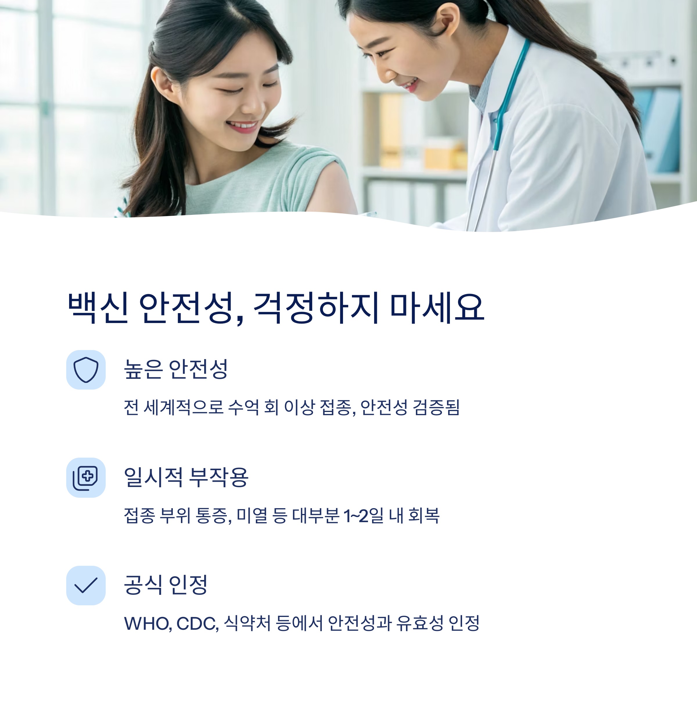 | 백신 맞으면 완전히 예방되나요? | 주요 유형은 예방 가능하나 100%는 아닙니다. 검진 병행 필요 |
