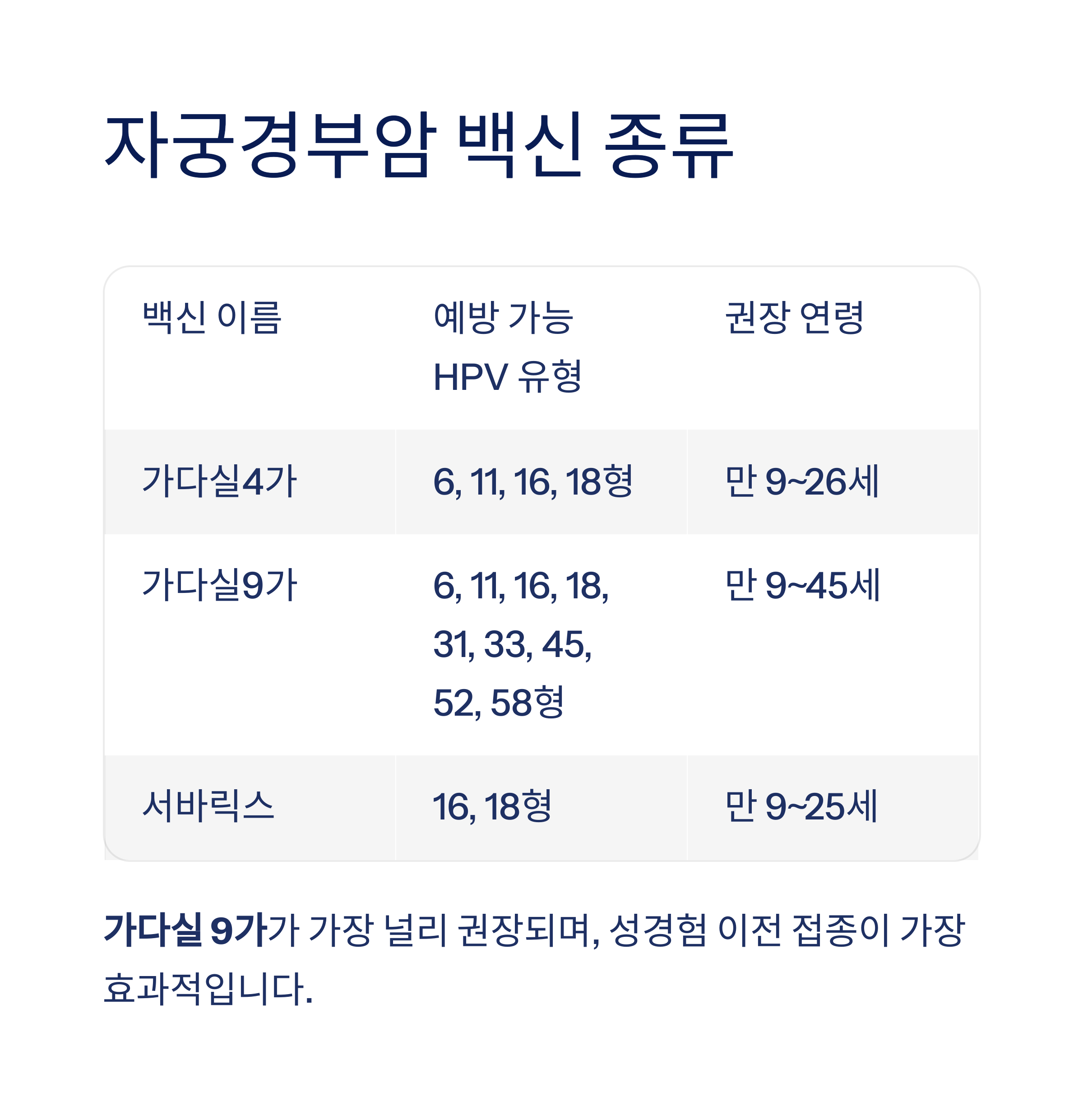 가장 널리 권장되는 백신은 '가다실 9가'로, 9종의 HPV를 예방할 수 있는 고효율 백신입니다.