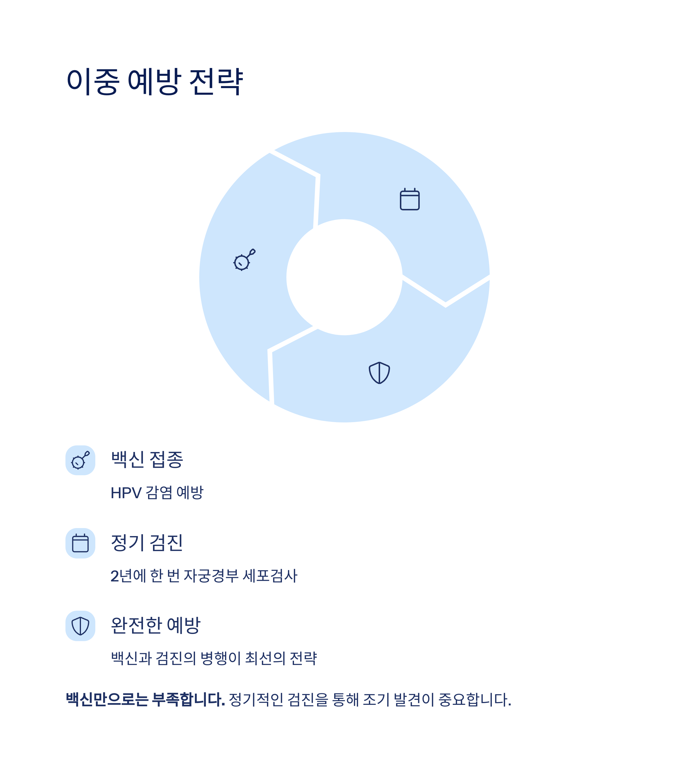 예방 접종 + 정기검진의 이중 전략이 자궁경부암을 막는 가장 확실한 방법입니다.