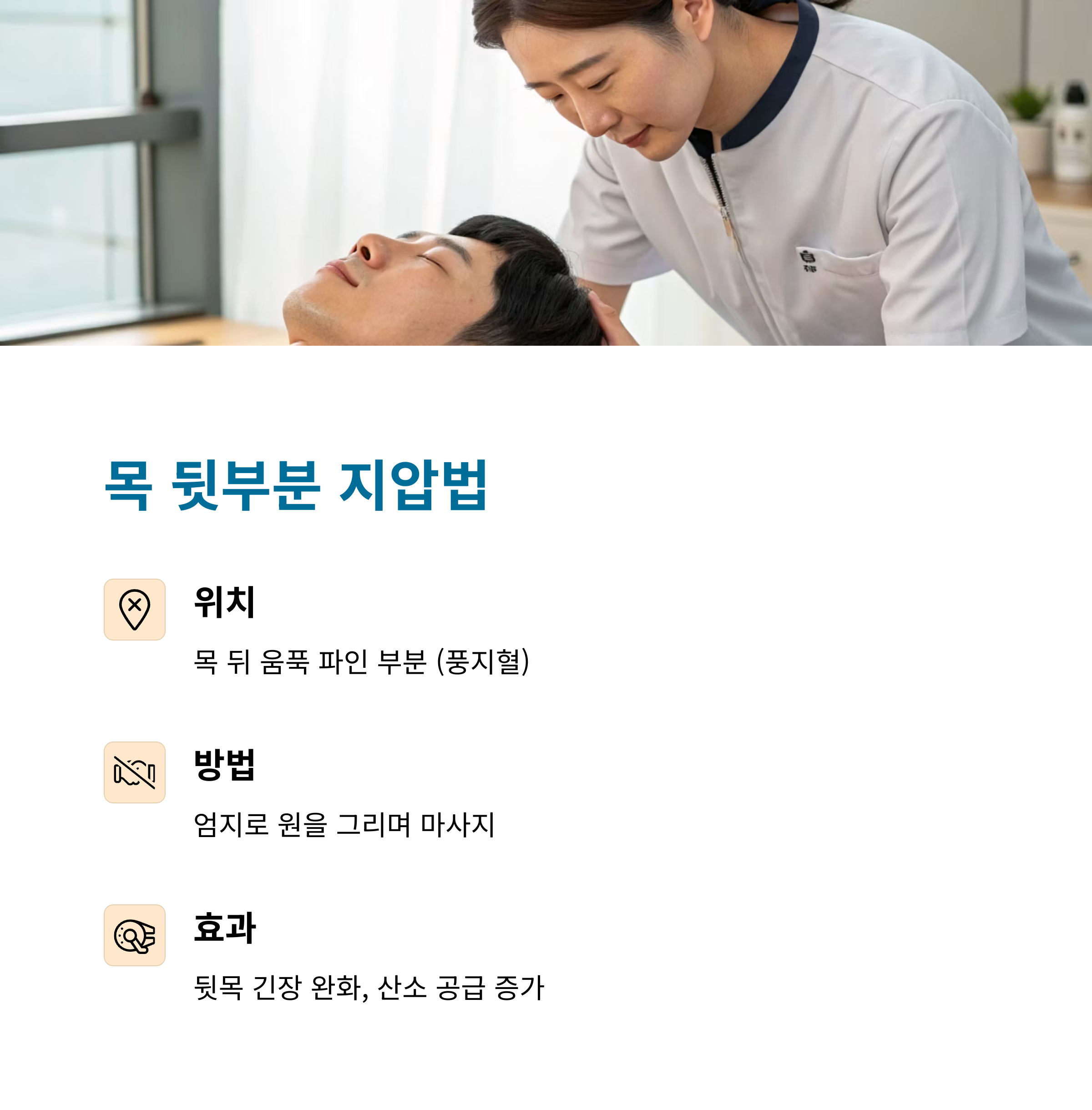 | 뒤통수 중앙 | 손가락으로 누르며 5초간 유지 | 뇌 압박감 완화 |