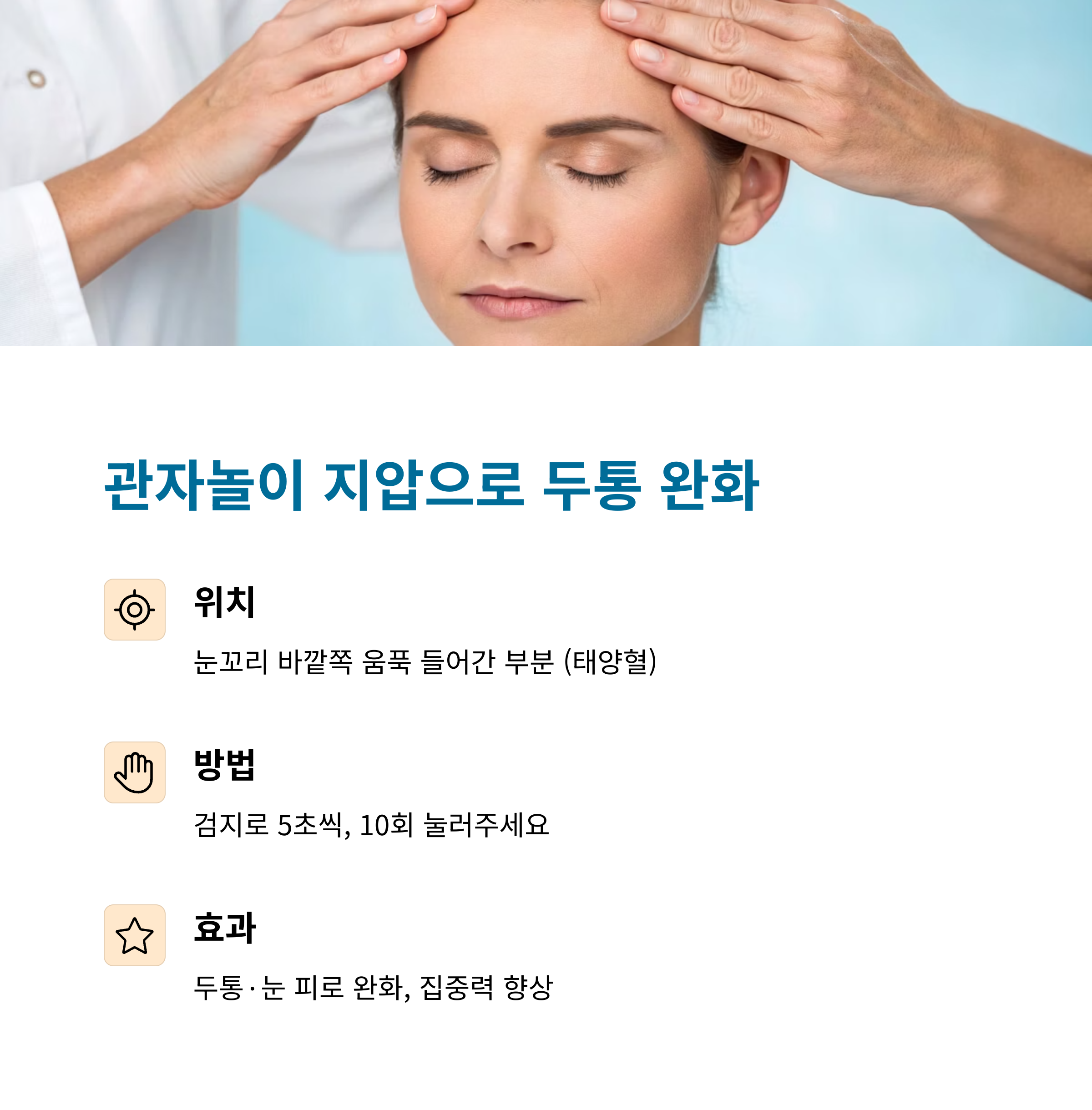 | 인당혈 | 눈 피로 해소, 스트레스 완화 | 장시간 PC작업, 독서 후 |