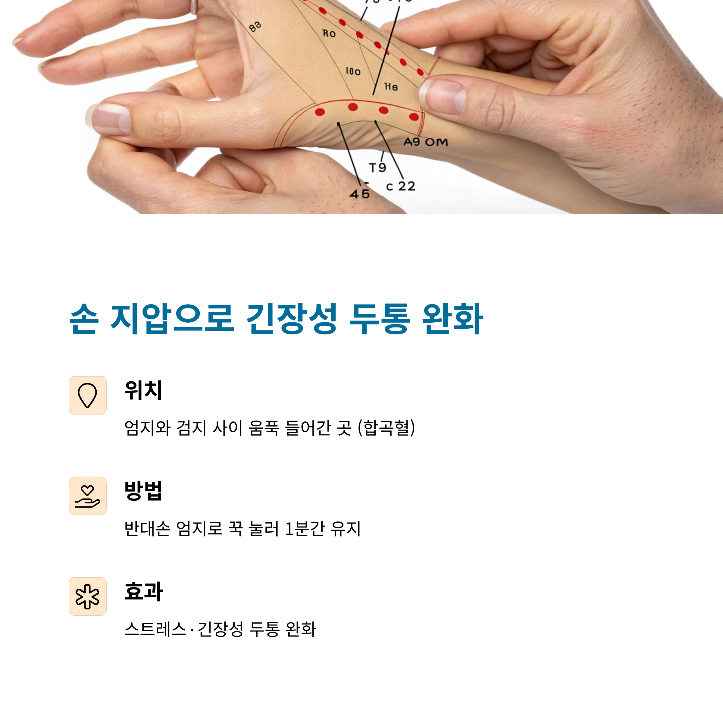 합곡혈은 양손 엄지와 검지가 만나는 부위로, 동양 의학에서는 만병통치혈로도 불릴 만큼 두통뿐 아니라 온갖 통증에 효과적이에요. 약간 아프다 싶을 정도로 강하게 눌러주는 게 포인트입니다.