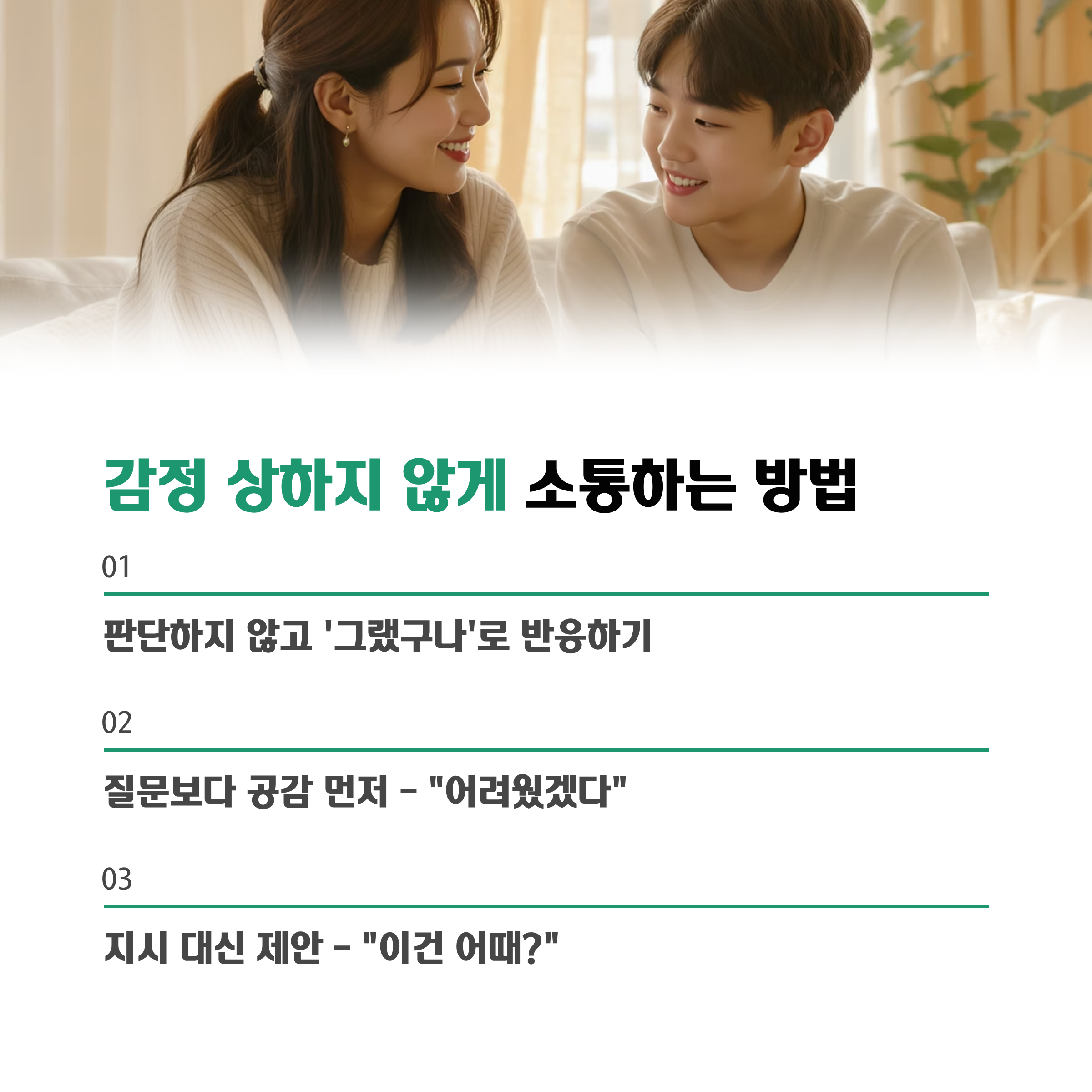 경청을 먼저 한 후, 아이가 조언을 원할 때 부드럽게 제안 형식으로 건네는 것이 효과적입니다.