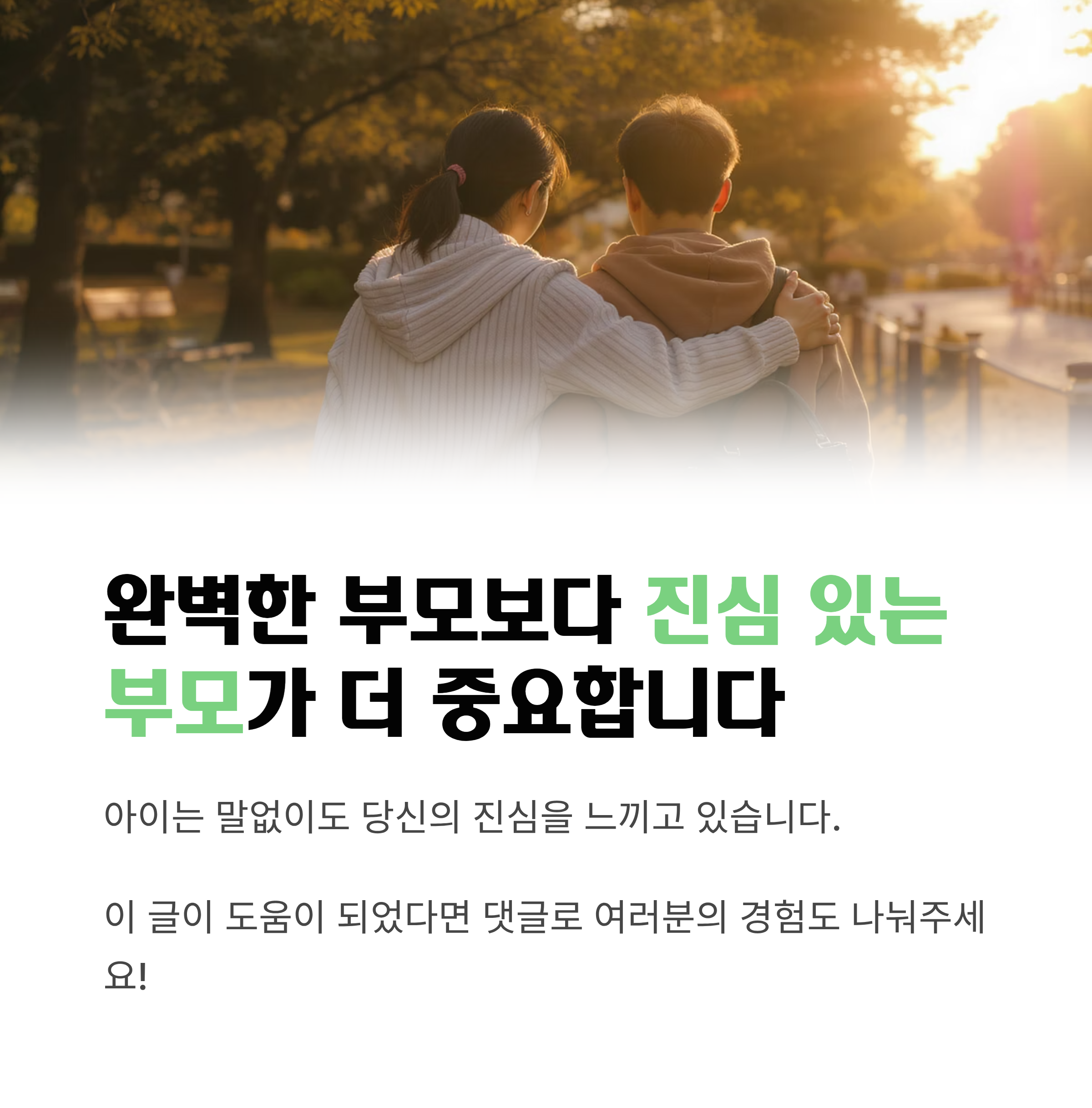 부모도 인간입니다. 실수도 하고 흔들리기도 합니다. 아이와 함께 성장 중이라는 걸 기억하세요. 완벽한 부모보다 진심 있는 부모가 더 중요합니다.