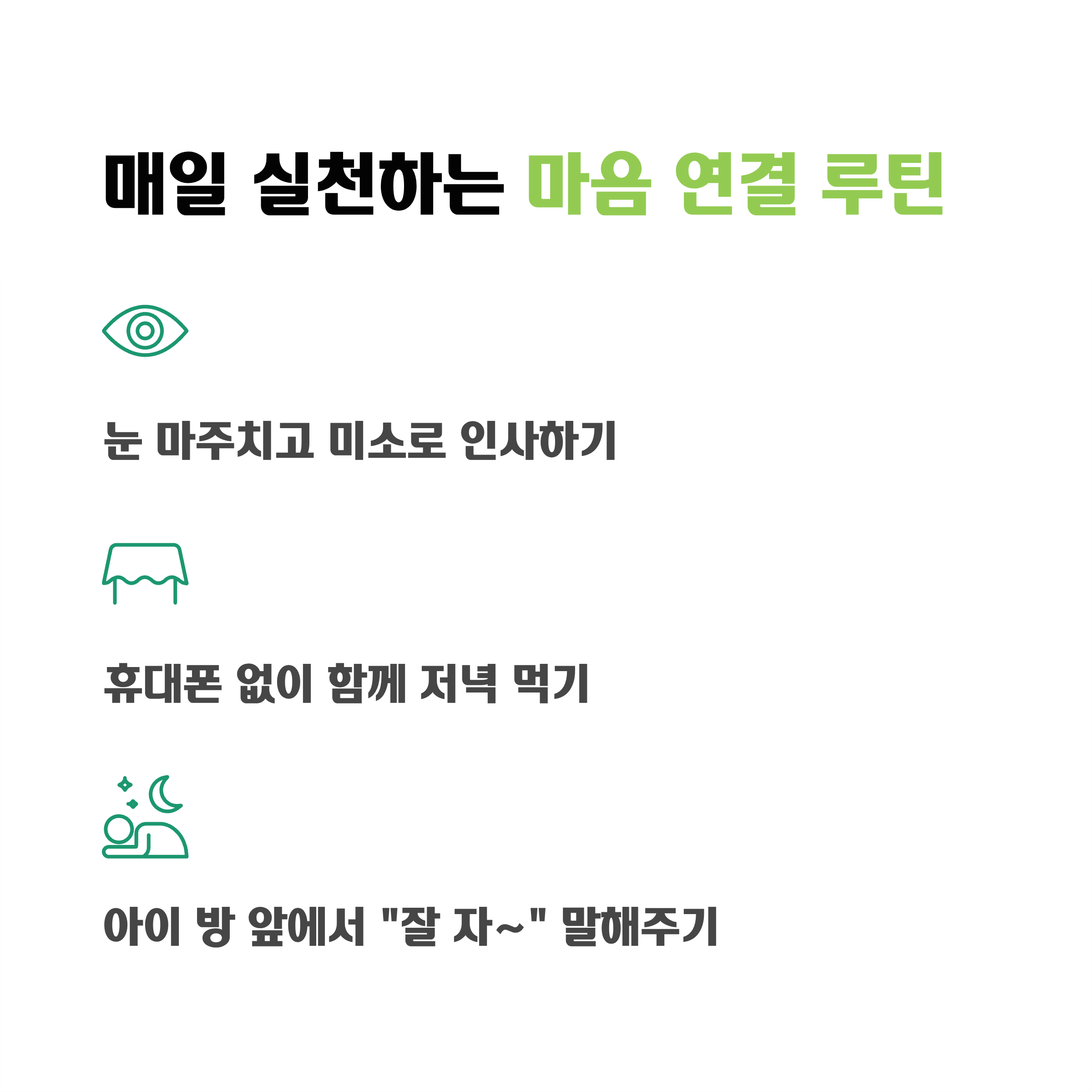 소통은 ‘한 번에 터놓는 대화’보다는 ‘매일 작은 연결’을 만들어가는 것이 더 중요합니다. 사춘기 아이에게 다가가기 위해서는 하루하루의 반복이 힘을 발휘하죠. 아래는 제가 실천했던 매일 10분 부모-자녀 루틴입니다.