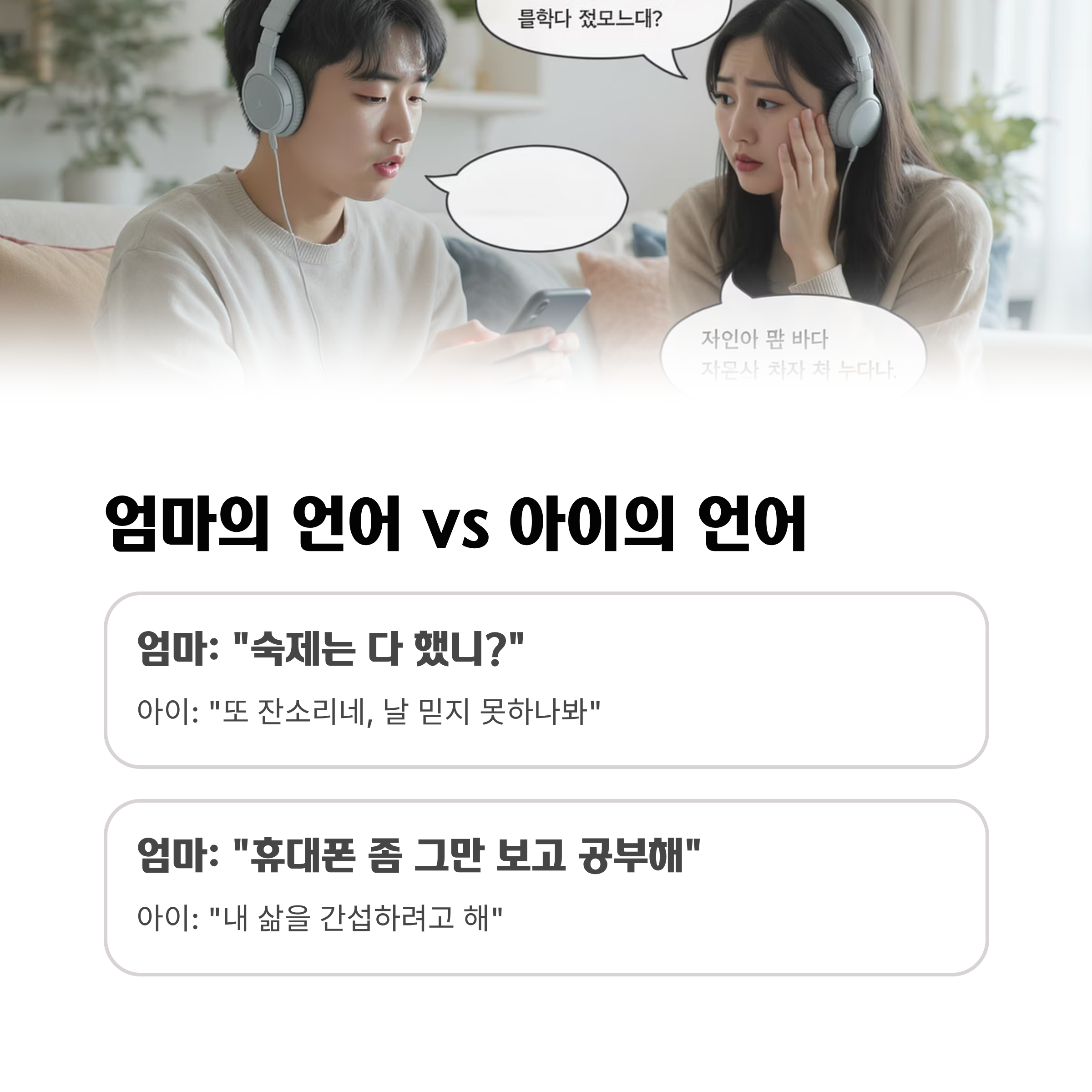 사춘기 아이와의 대화가 어려운 이유 중 하나는 같은 말을 해도 서로 다른 언어로 받아들이기 때문입니다. 엄마는 걱정과 사랑으로 말하지만, 아이는 간섭과 통제로 느끼죠. 다음 표를 통해 그 차이를 살펴보세요.