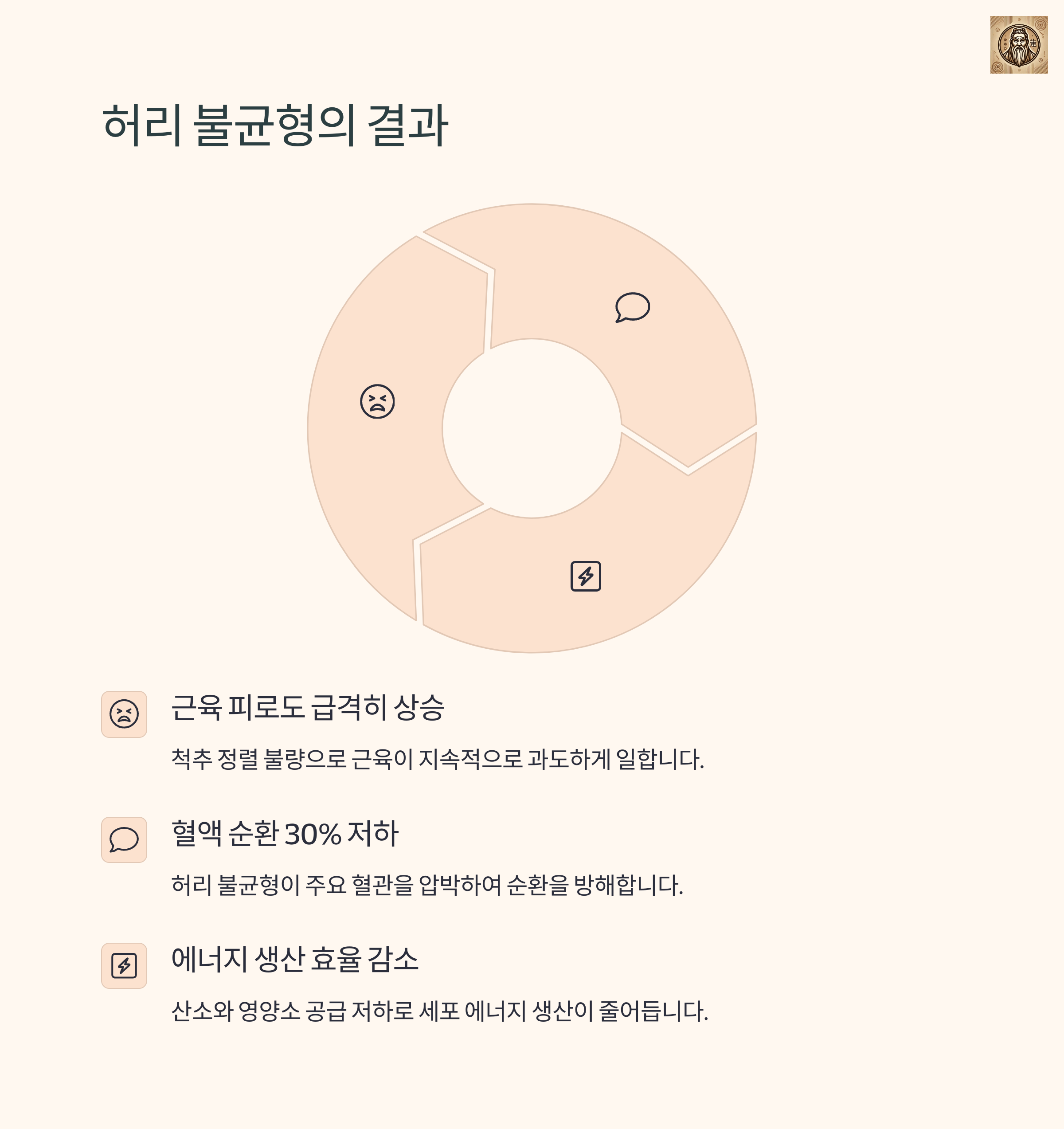 이런 비정상적인 체형은 근육과 인대에 지속적인 압박을 가하며, 혈액순환과 림프순환을 방해하게 됩니다. 결과적으로 산소와 영양소 공급이 줄어들고, 근육 피로와 전신 피로로 이어지는 것입니다.