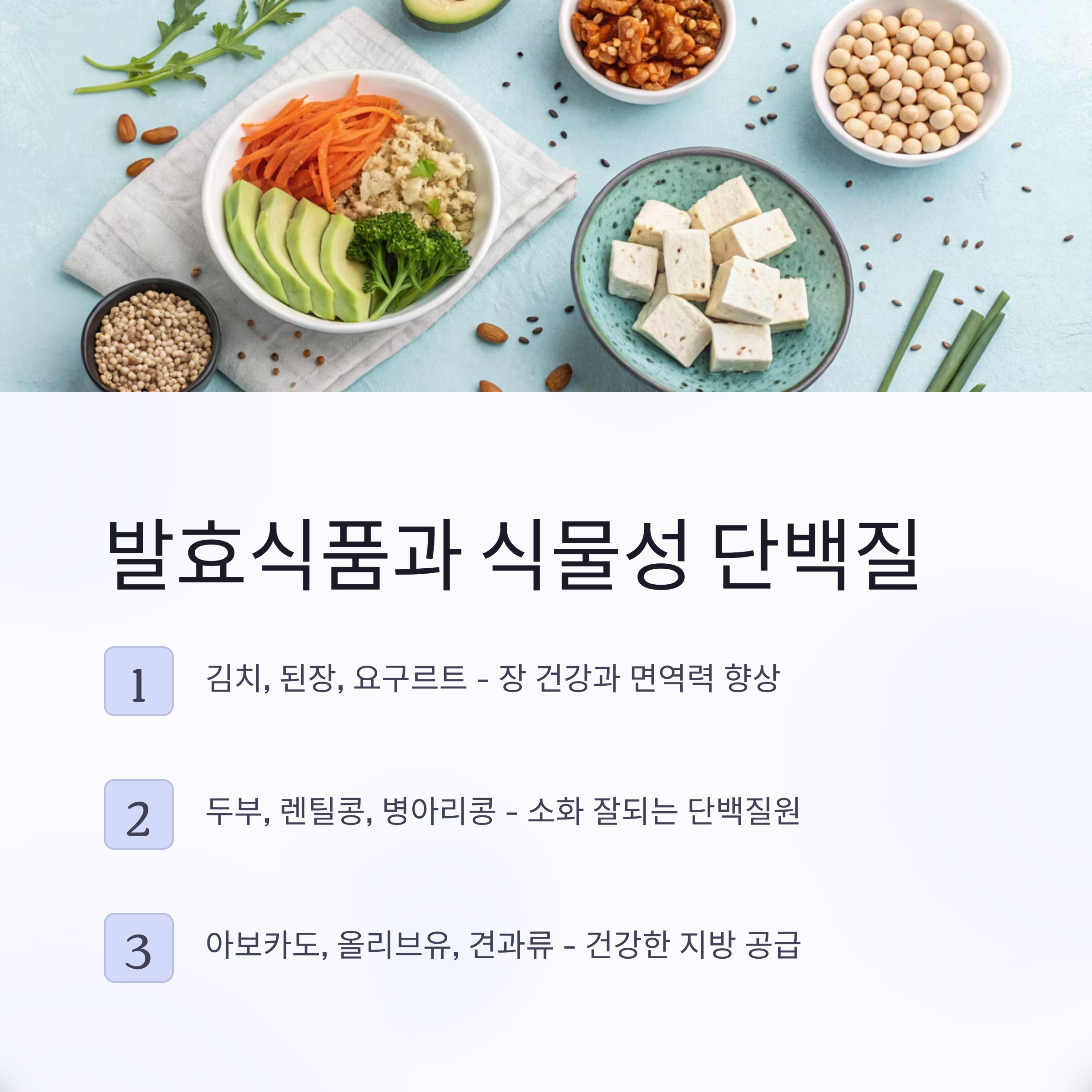자연식 식단에서 장 건강을 챙기려면 발효식품은 꼭 넣어야 할 필수 재료입니다. 유산균과 효소가 풍부하게 살아 있는 발효식품은 소화 흡수를 돕고 면역력을 끌어올려 줘요. 우리나라의 대표적인 김치뿐만 아니라, 된장, 청국장, 낫토, 요구르트 등도 좋은 선택입니다. 매 끼니에 발효식품 한 가지를 넣는 것만으로도 장 트러블을 줄이고 복부 팽만감을 완화하는 효과가 있어요.