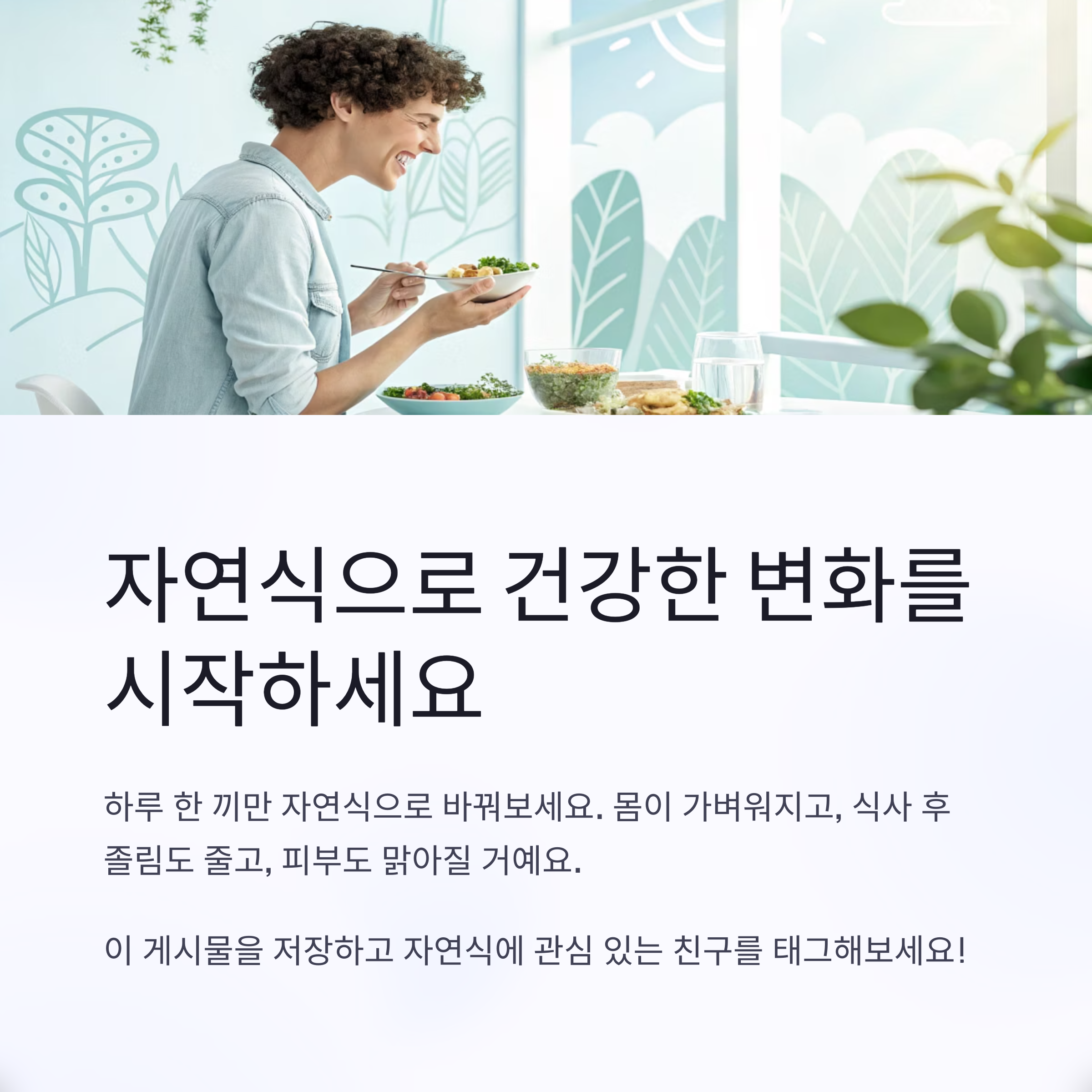 자연식 식단을 시작한다고 해서 갑자기 모든 식재료를 바꾸는 건 어렵죠. 저도 처음에는 하루 한 끼만 자연식으로 바꾸기 시작했어요. 그렇게 점차 익숙해지면서 지금은 제 식탁의 70% 이상이 자연식 재료로 채워져 있어요. 몸이 가벼워지고, 식사 후 졸림도 줄고, 피부도 맑아진 걸 느끼면서 ‘아, 식재료가 정말 중요하구나’라고 느꼈죠. 여러분도 이번 주에 한 끼만 자연식으로 바꿔보세요. 분명히 몸이 반응할 거예요!