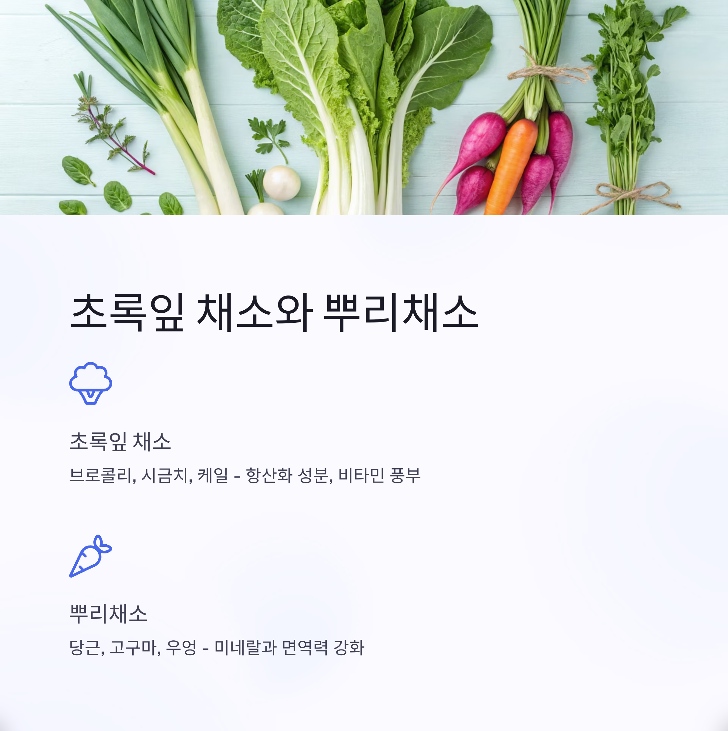 - 당근 – 베타카로틴이 풍부하여 시력 보호와 피부 건강에 탁월