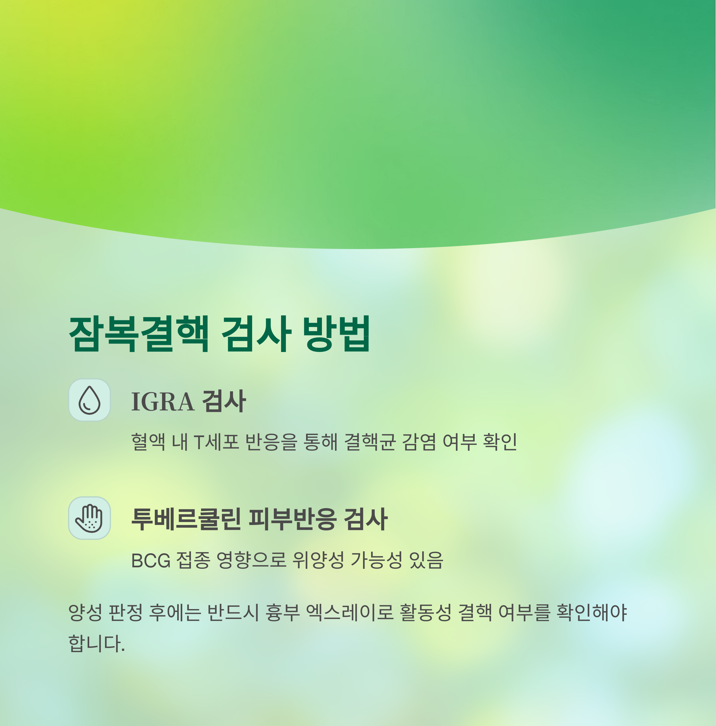 양성 판정 후에는 반드시 흉부 엑스레이를 통해 활동성 결핵 여부를 먼저 배제해야 하며,