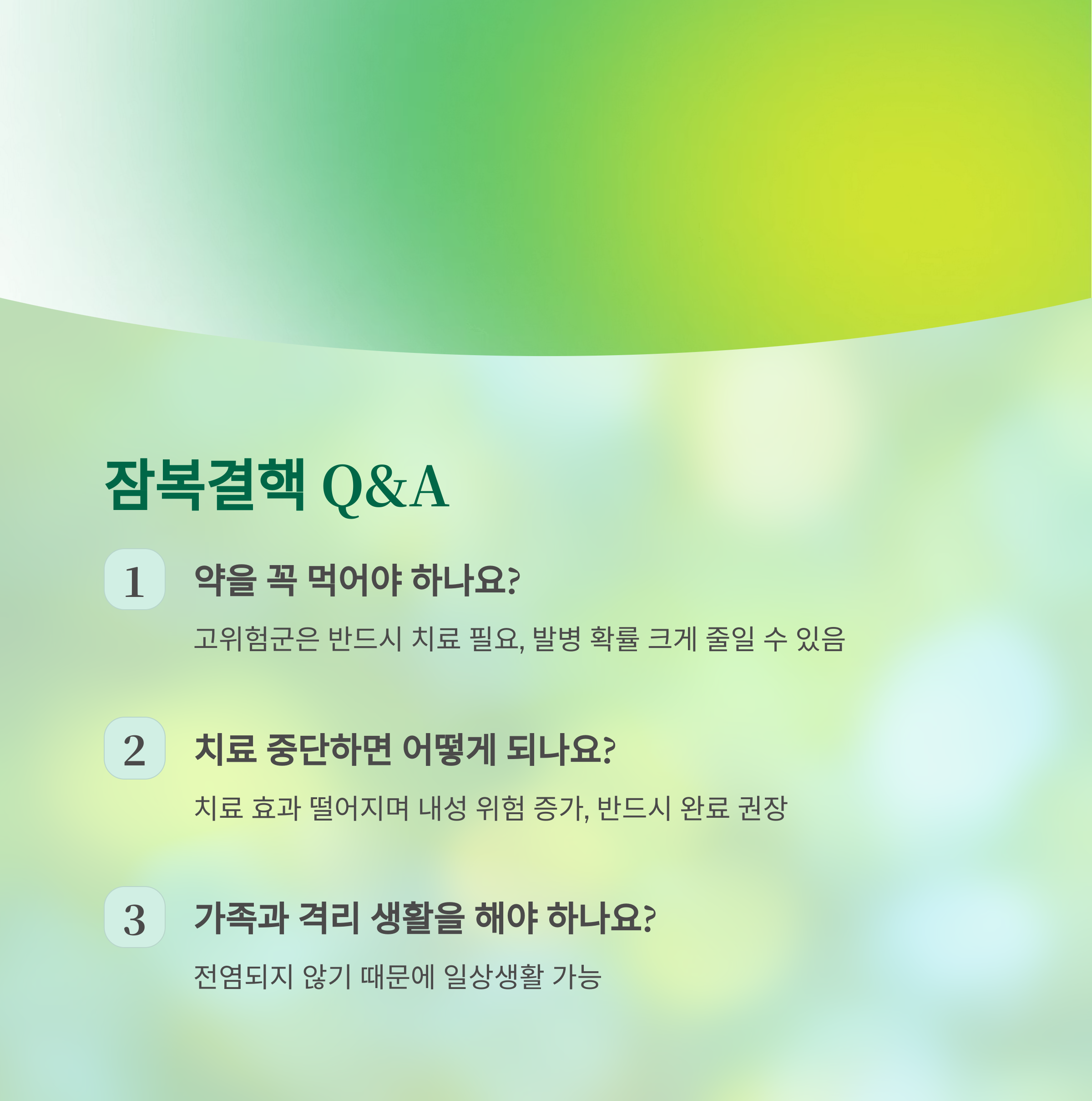 | 약을 꼭 먹어야 하나요? | 고위험군은 반드시 치료 필요, 발병 확률 크게 줄일 수 있음 |