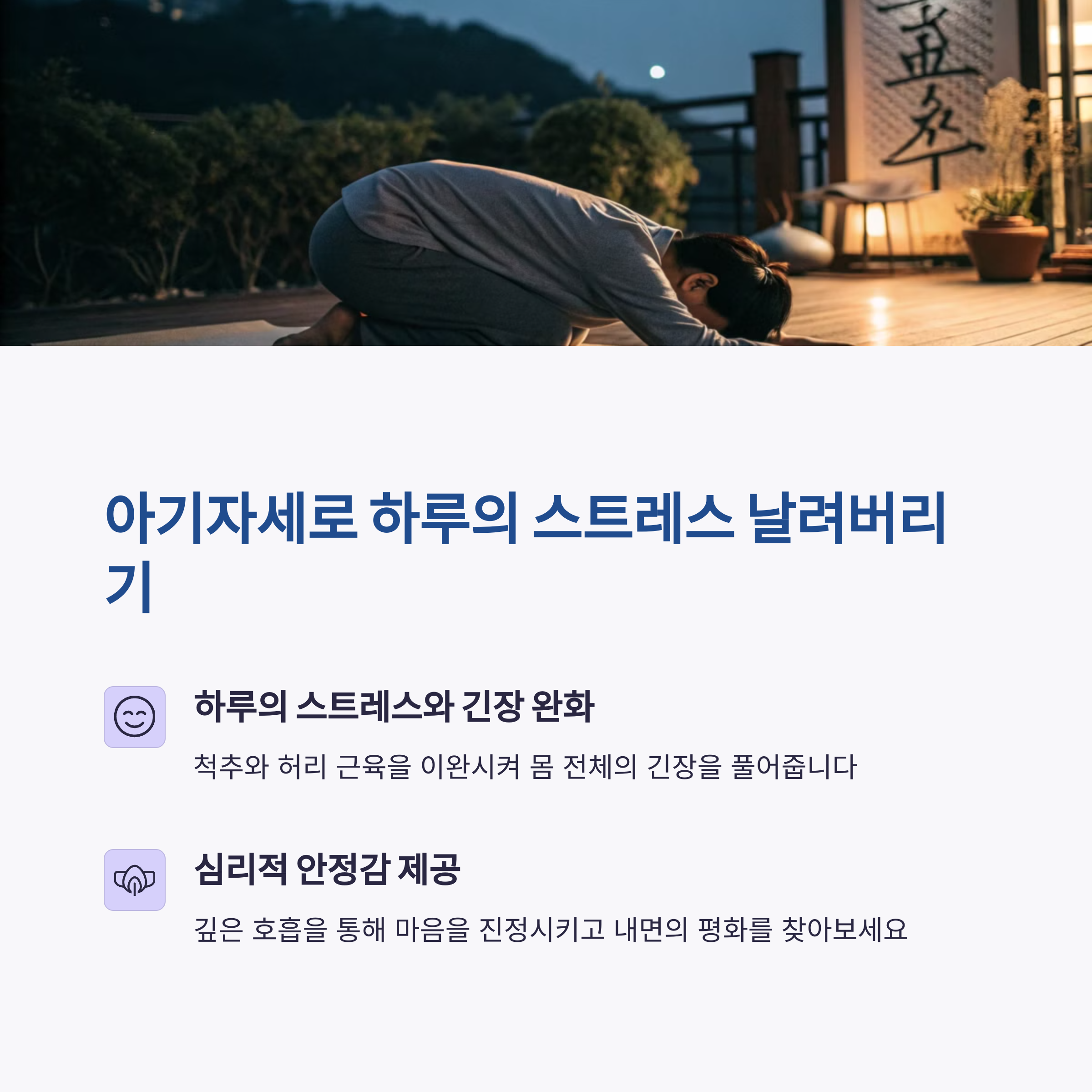 하루를 마무리하며 긴장을 푸는 데에 최고의 동작, 바로 '아기자세'입니다. 무릎을 꿇고 이마를 바닥에 대며 손을 앞으로 길게 뻗는 이 동작은, 심리적으로 안정감을 주고 등과 골반 주변의 뭉침을 자연스럽게 풀어줘요. 특히 스트레스가 많은 날에는 이 자세로 몇 분만 있어도 마치 포근한 이불 속에 들어간 듯한 느낌이 들더라고요.
