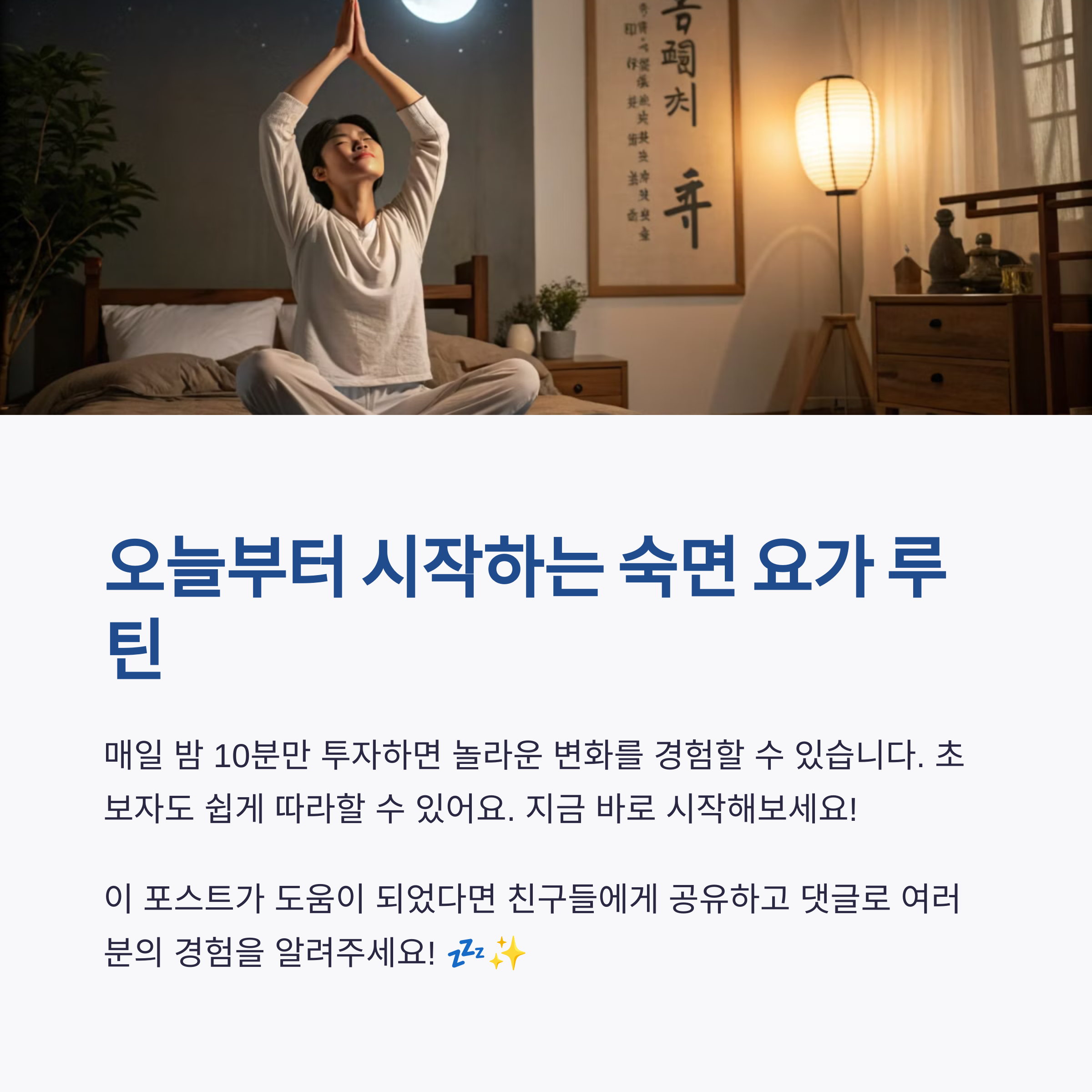 오늘 소개한 ‘자기 전에 하면 좋은 요가 동작 5가지’, 여러분도 한번 시도해 보세요. 하루를 조용히 정리하며 나 자신에게 집중하는 시간, 생각보다 큰 위안을 줄 거예요. 저는 이 루틴 덕분에 정말 수면의 질이 달라졌거든요. 단 10분이라도 몸을 돌봐주는 그 순간이 꽤 특별하게 느껴집니다. 오늘 밤, 조용한 음악과 함께 요가 매트 위에서 나만의 시간을 가져보는 건 어떨까요?