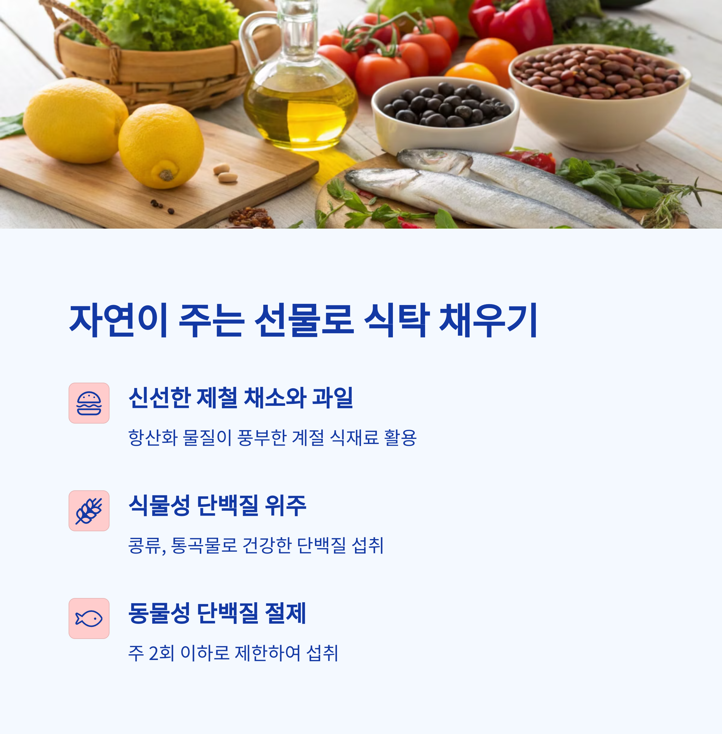 | 장수 식단이란? | 자연식 위주의 식사로 면역과 항산화력을 강화합니다. |