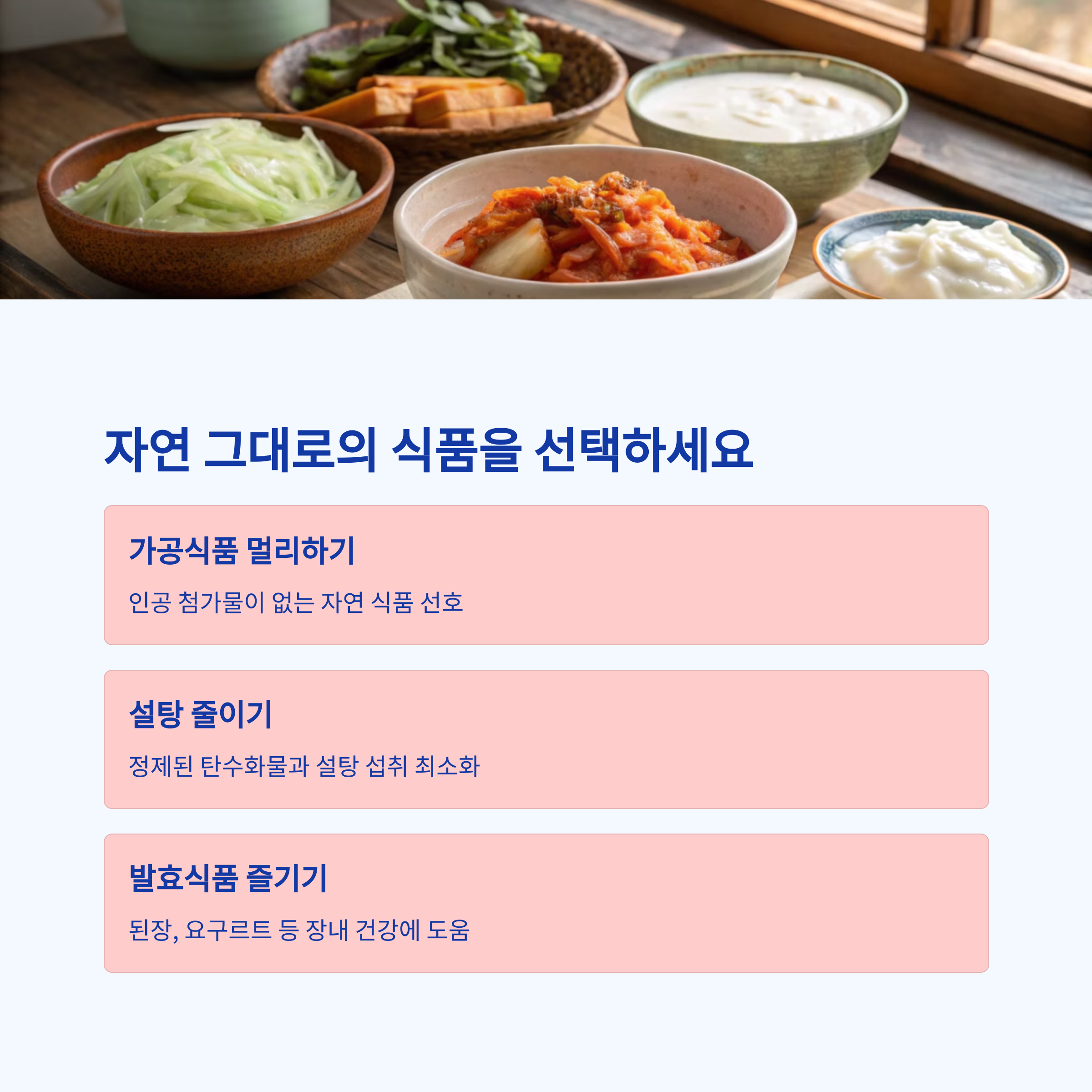 | 소식 실천 | 자연식 위주 | 꾸준한 식습관 |