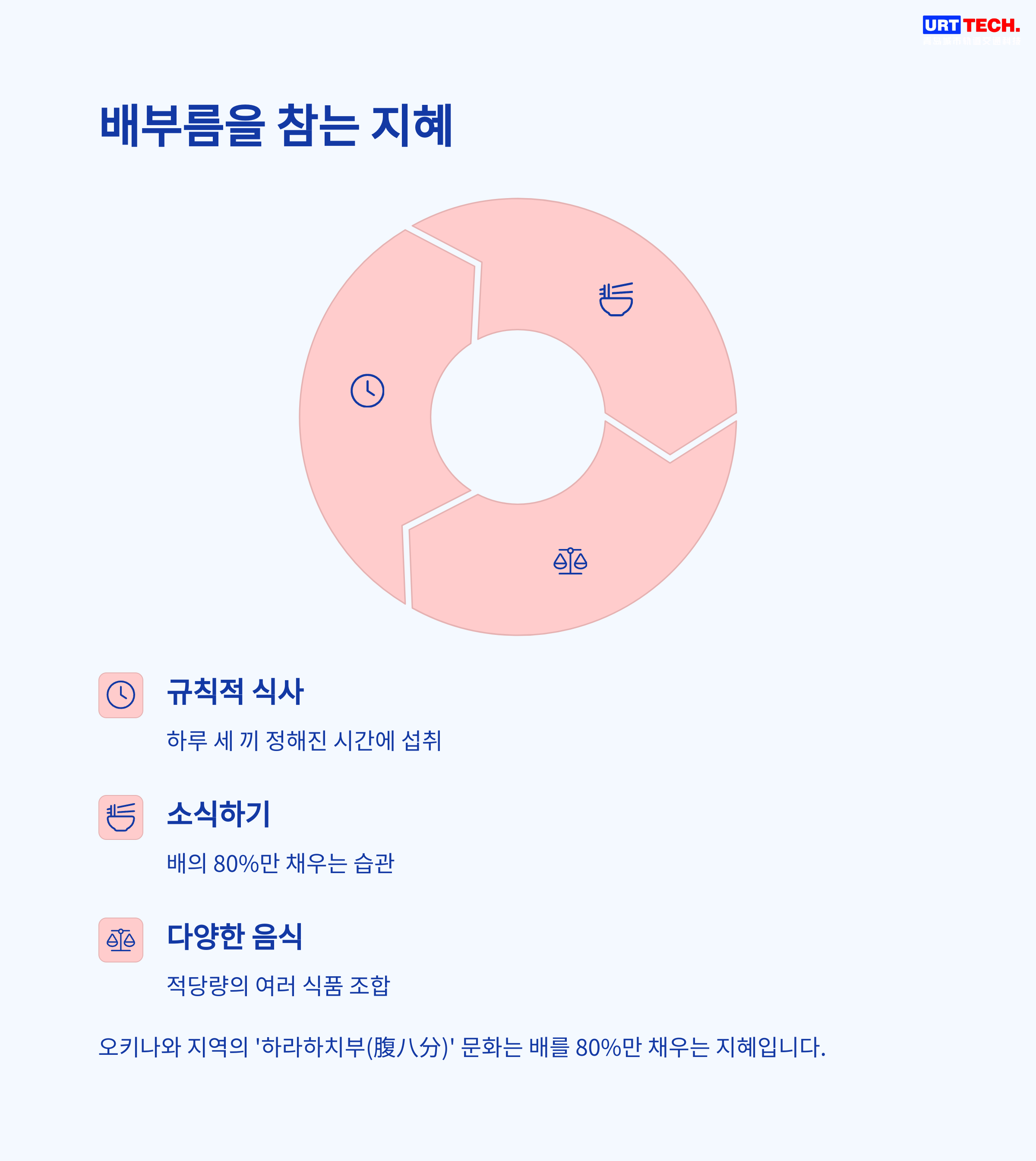 | 배부르기 전 멈추는 식사 습관 | 가공하지 않은 제철 식재료 사용 | 하루 세끼를 규칙적으로 챙기는 자세 |