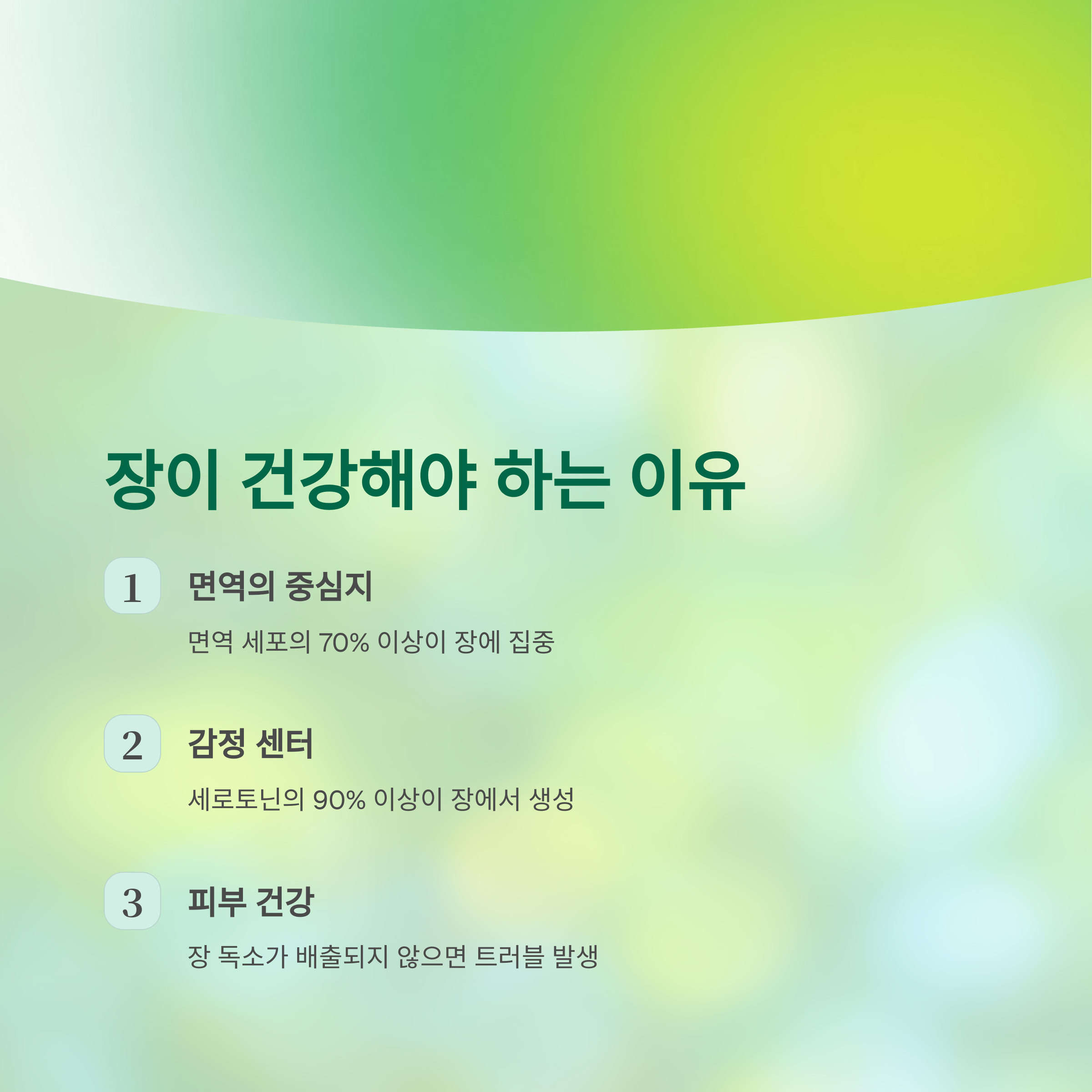 또한 장 건강은 피부에도 영향을 미칩니다. 장에서 독소가 제대로 배출되지 않으면 트러블, 여드름, 심한 경우 아토피나 습진까지 생길 수 있어요. 즉, 장은 ‘겉모습’과도 연결되어 있죠. 장 건강이 좋아야 에너지 순환도 원활하고, 몸이 덜 피곤하고, 마음도 안정되는 걸 체감할 수 있습니다.