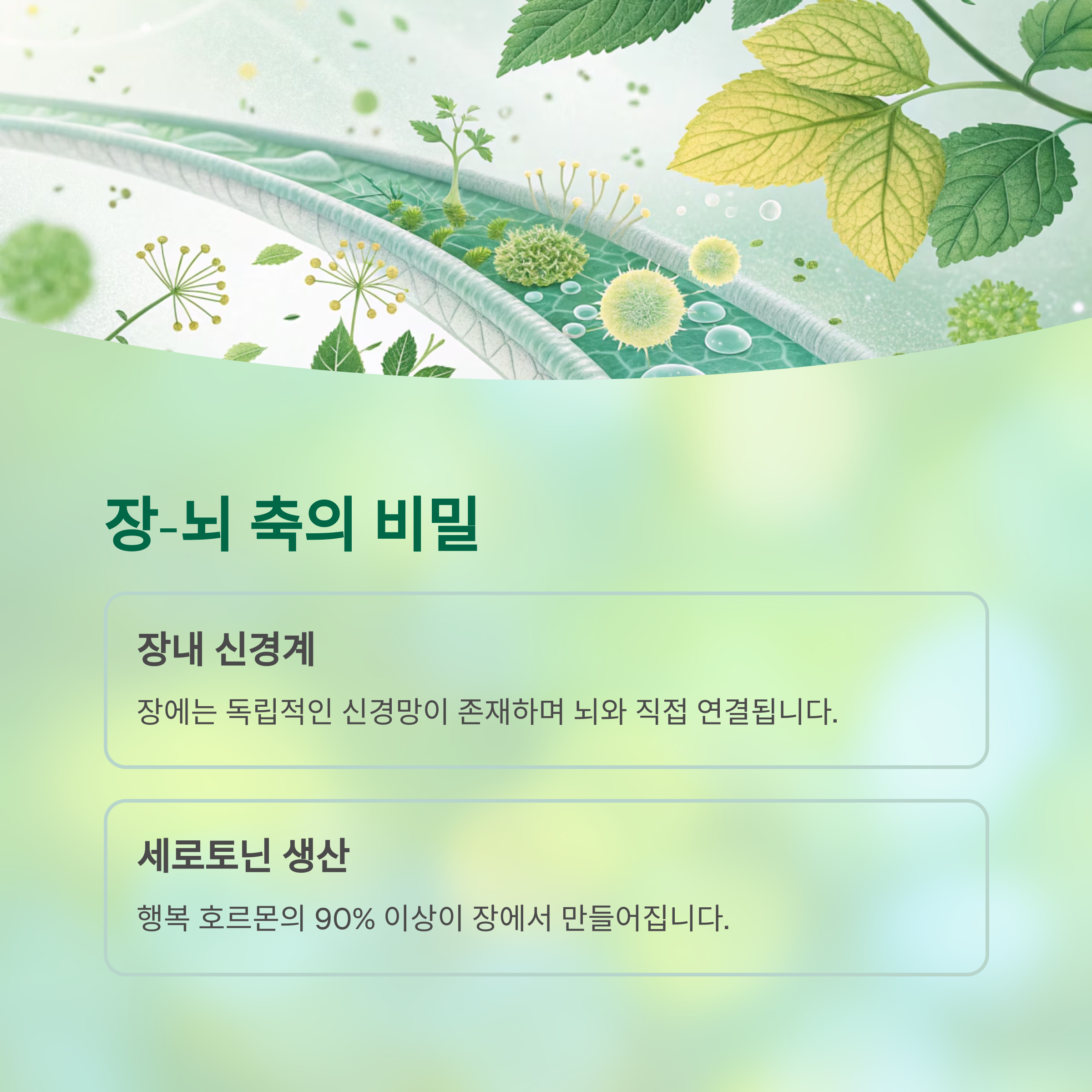 장은 단순히 음식을 소화하는 기관이 아닙니다. 장에는 '장내 신경계(Enteric Nervous System)'라는 독립적인 신경망이 존재하며, 이는 뇌와 직접 연결되어 있죠. 이 연결 통로를 '장-뇌 축(Gut-Brain Axis)'이라고 부르는데, 장에서 생성되는 신경전달물질(세로토닌, 도파민 등)이 감정과 직결되는 이유가 여기에 있습니다. 무려 세로토닌의 90% 이상이 장에서 만들어진다는 사실, 알고 계셨나요?