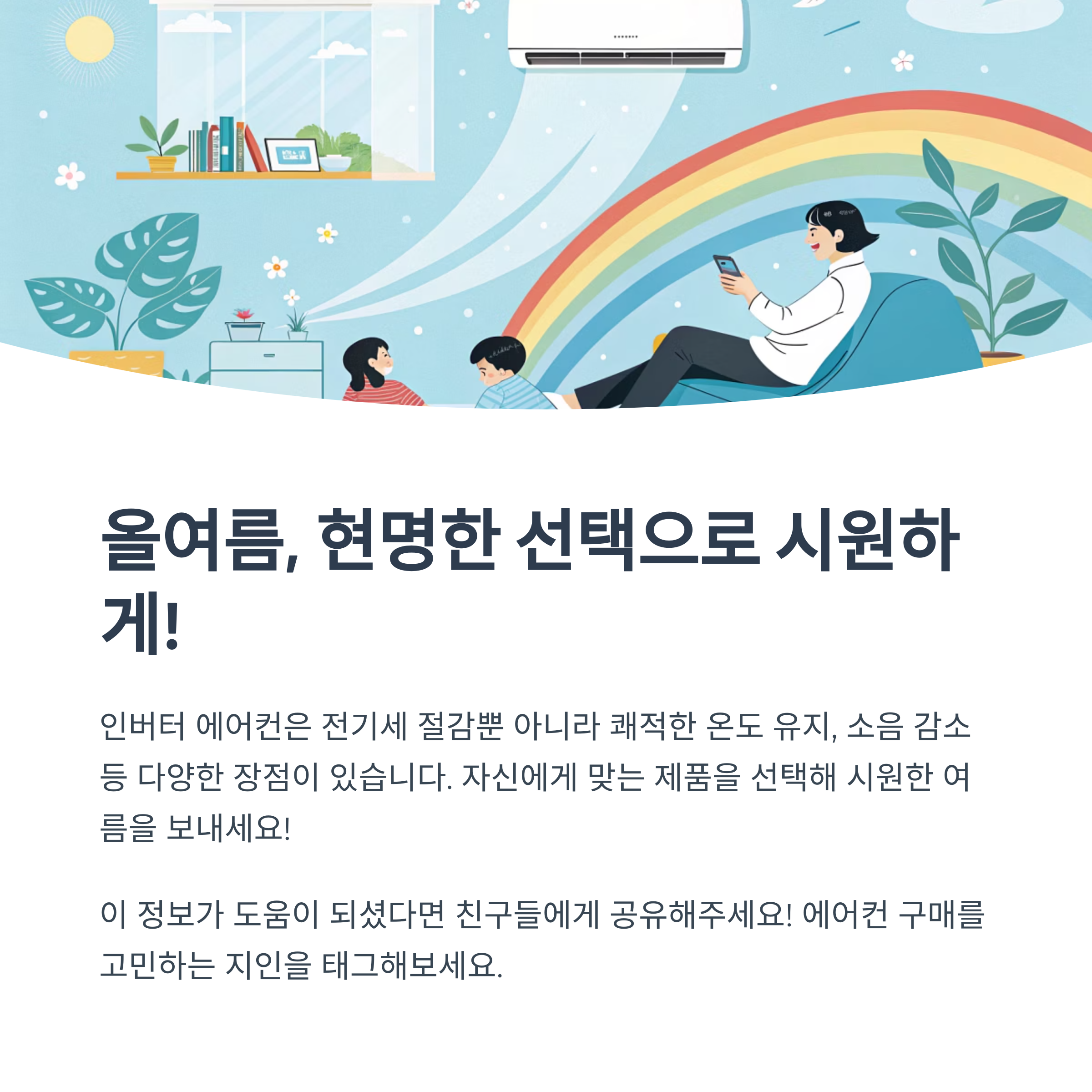 지금까지 인버터 에어컨의 작동 원리부터 전기세 절감 효과, 성능 차이, 장단점까지 상세히 살펴봤습니다. 기술 하나에도 이렇게 많은 차이가 있다는 걸 알게 되니, 단순히 "비싼 게 좋은 거겠지"라는 막연한 기준이 아닌, 진짜 내게 필요한 기능이 무엇인지 생각해보게 되네요. 올여름, 조금 더 똑똑하고 현명한 선택으로 시원하고 쾌적한 생활을 누려보세요! 여러분의 선택이 좋은 결과로 이어지길 진심으로 응원합니다.