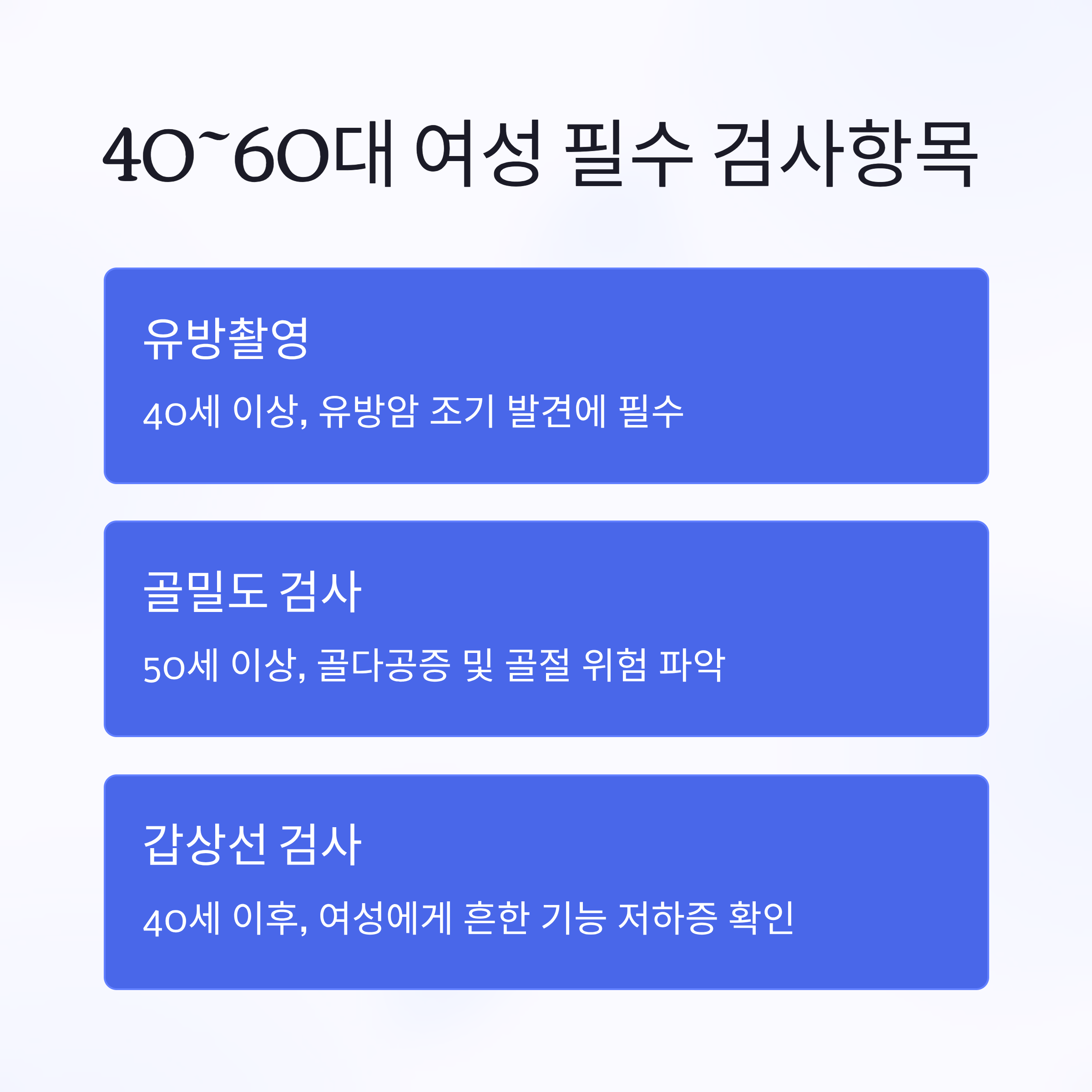 건강검진 항목도 나이에 따라 달라져야 해요. 특히 여성은 호르몬 변화로 인해 생기는 여성 질환, 골밀도, 유방 관련 검사를 놓치면 안 돼요. 아래 표는 40대와 60대에 추천되는 건강검진 항목을 정리한 거예요.