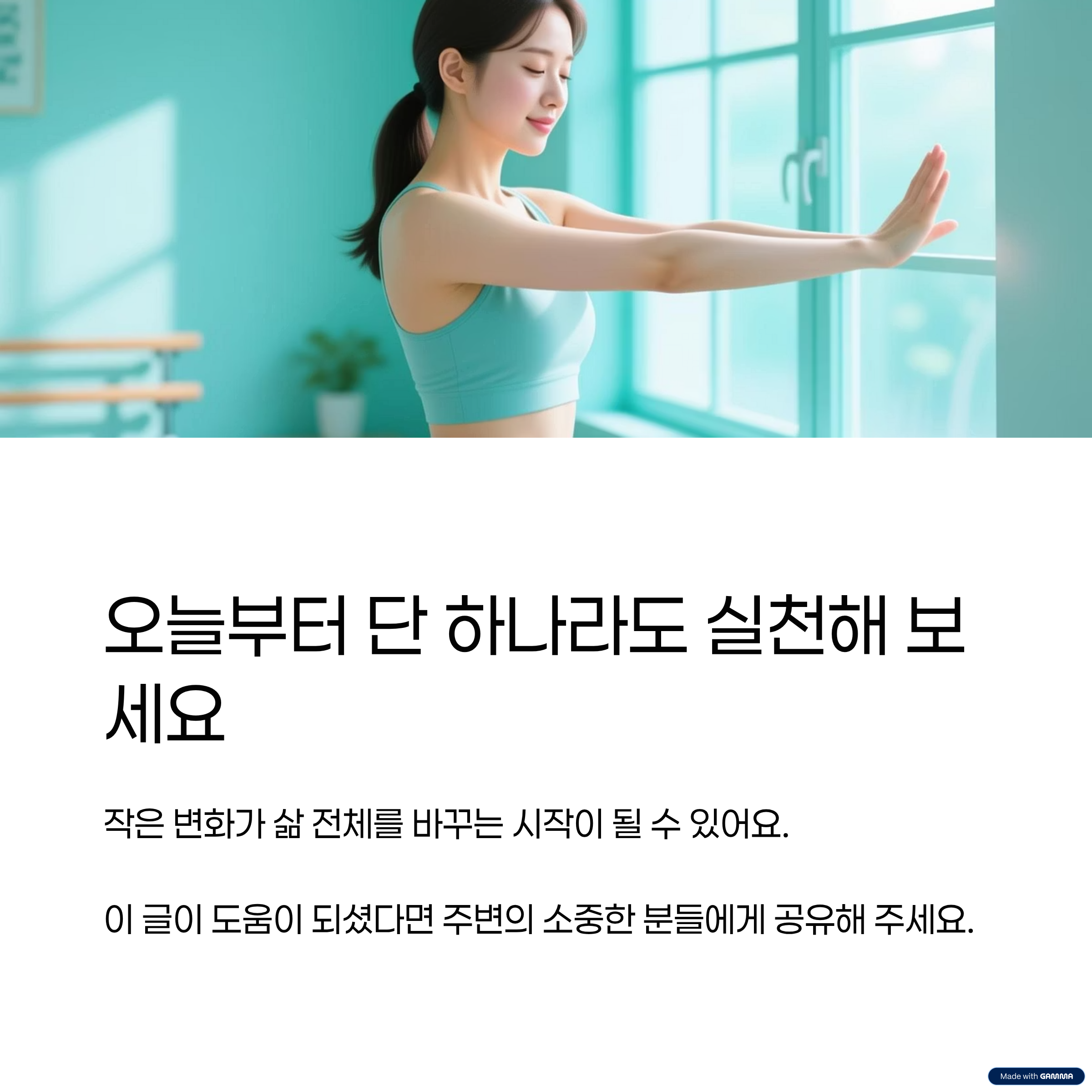 심리 안정 루틴에서 빠질 수 없는 것이 바로 ‘신체 활동’입니다. 몸이 굳어 있으면 마음도 따라 굳게 되거든요. 특히 중년 여성은 어깨, 목, 허리 통증이 심리적 스트레스와 밀접한 연관이 있습니다. 간단한 스트레칭 동작 몇 가지만 반복해도 놀라운 차이를 느낄 수 있어요.
