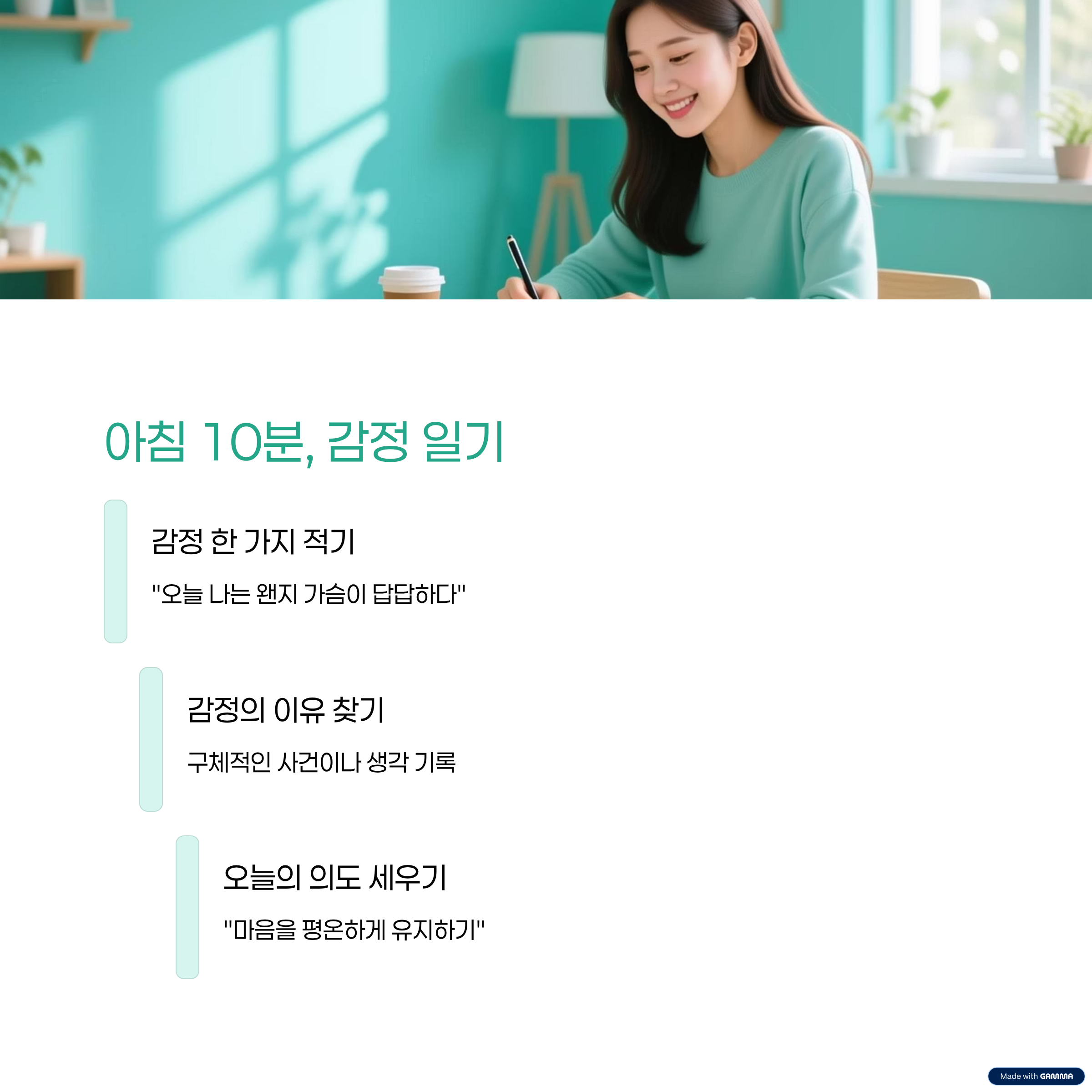 하루를 시작하기 전, 단 10분만이라도 나의 감정을 정리해 보는 시간. 이것이 바로 ‘감정 일기’입니다. 커피 한 잔과 함께, 혹은 햇살이 들어오는 창가에 앉아 오늘 느끼는 감정 하나를 적어보세요. "나는 오늘 왠지 모르게 가슴이 답답하다." 혹은 "기대되는 하루가 될 것 같다." 이렇게 단순한 감정 기록만으로도 내면을 돌아보게 되고, 하루의 중심을 잡을 수 있어요.