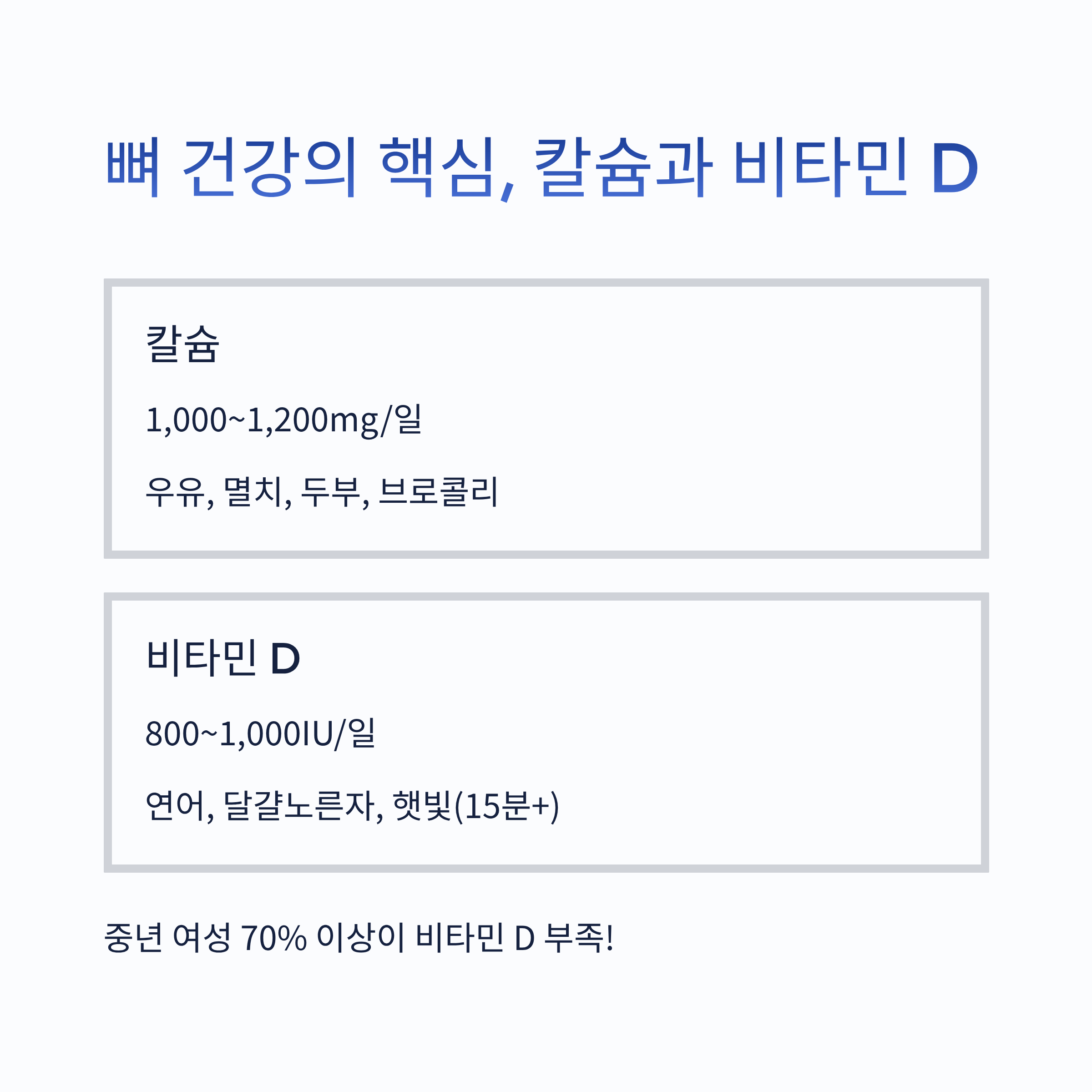뼈 건강하면 제일 먼저 떠오르는 영양소가 바로 칼슘과 비타민 D죠. 칼슘은 뼈의 주성분이고, 비타민 D는 칼슘이 몸에 잘 흡수되도록 도와주는 조력자 역할을 해요. 그런데 우리나라 중년 여성의 70% 이상이 비타민 D가 부족하다는 사실, 알고 계셨나요? 햇빛을 잘 안 쬐거나 외출이 적은 생활습관 때문이에요. 특히 겨울철엔 더더욱 심하죠.