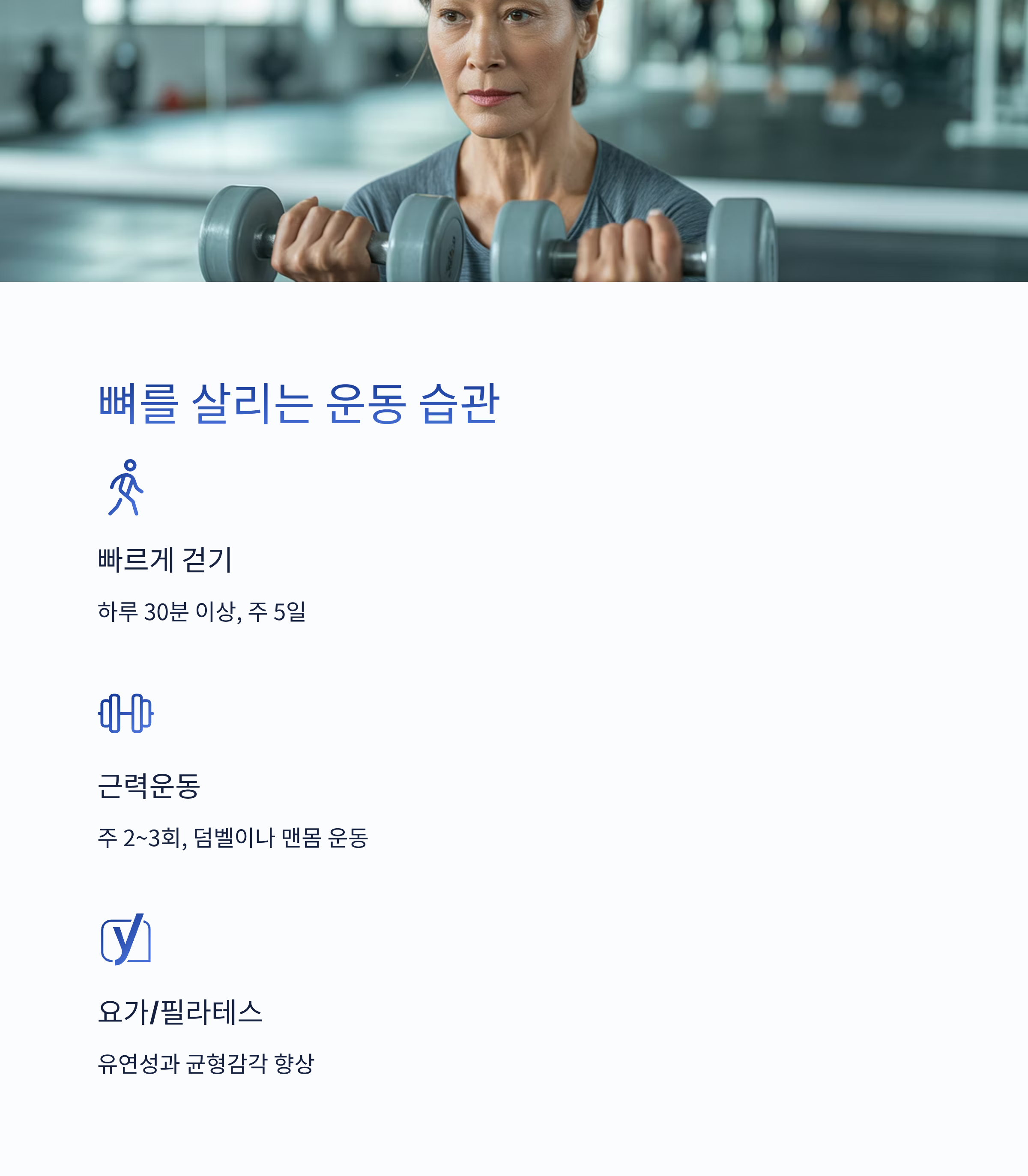 운동은 뼈 건강에 있어 빠질 수 없는 요소예요. 근육이 튼튼해야 뼈가 덜 무리되고, 뼈에 적절한 자극을 줘야 골밀도가 유지되거든요. 특히 중년 여성에게 추천하는 운동은 아래와 같아요: