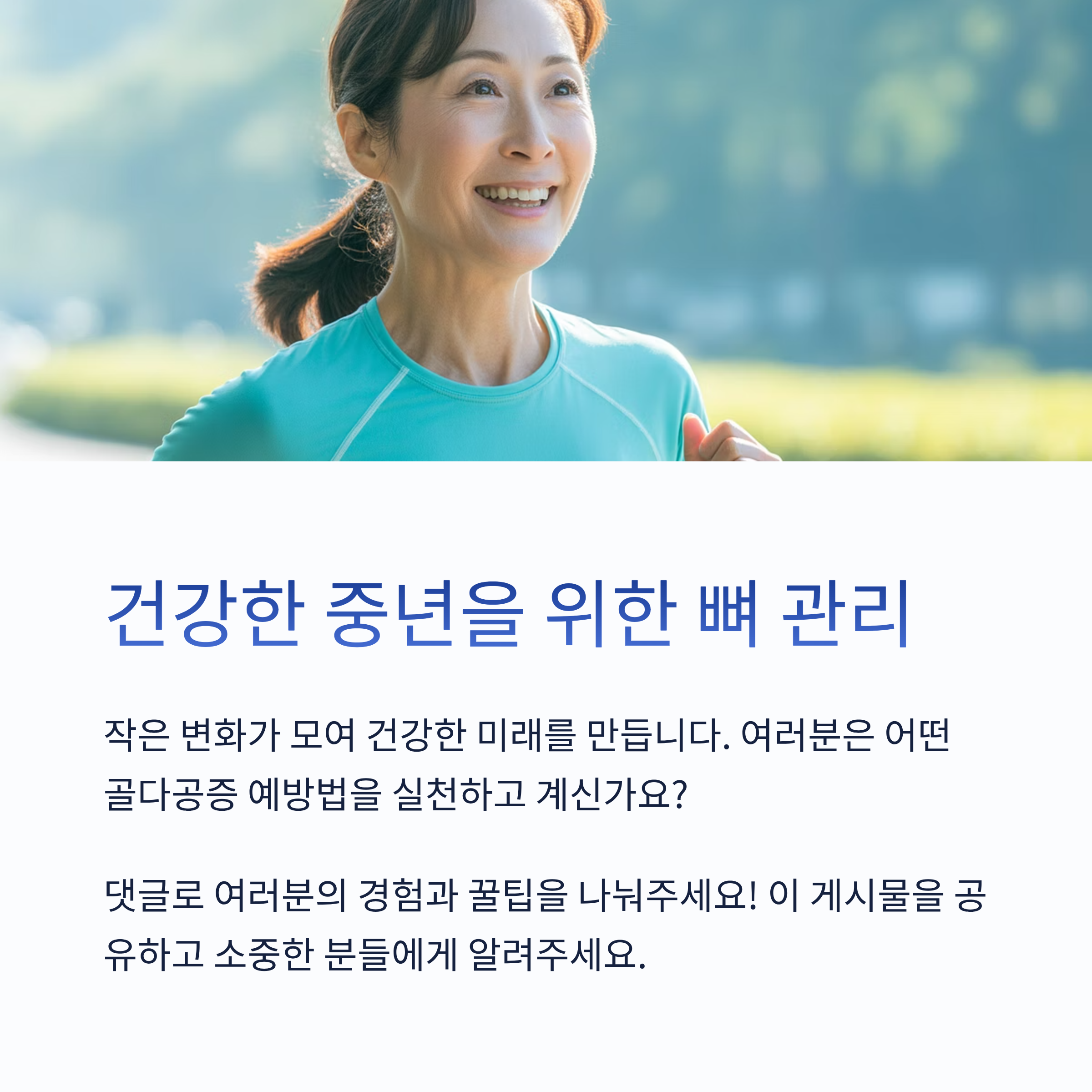 오늘은 중년 여성의 뼈 건강과 골다공증 예방에 대해 함께 알아봤습니다. 우리 몸을 지탱해 주는 뼈는 소중한 자산이에요. 나이가 들수록 더 신경 써야 하는 만큼, 오늘 소개한 실천법을 하나씩 적용해 보시길 추천드려요. 작은 변화가 모여 건강한 미래를 만들어 준답니다. 여러분은 어떤 골다공증 예방법을 실천하고 계신가요? 댓글로 여러분의 경험과 꿀팁도 나눠 주세요. 함께 건강한 중년을 만들어가요!