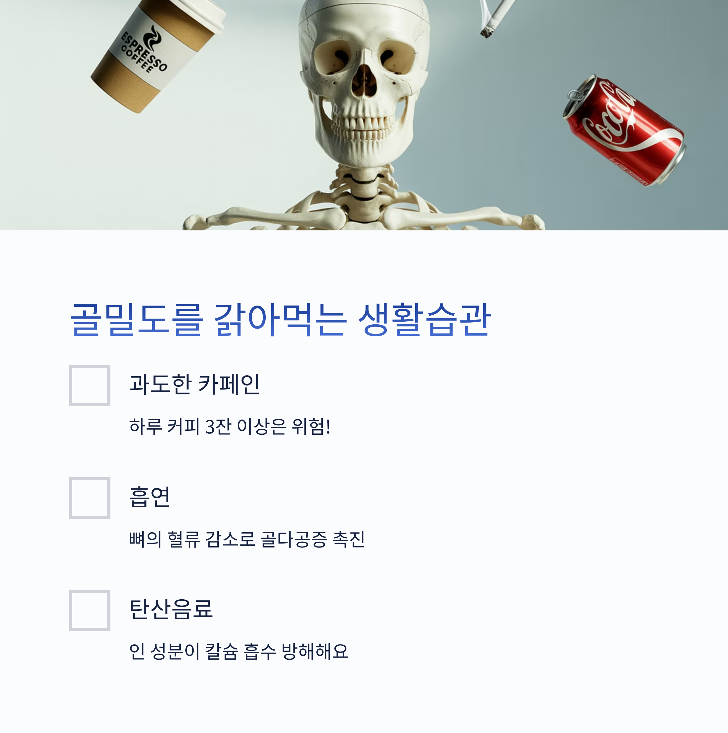 중년 여성의 뼈 건강을 해치는 가장 큰 적은 무심코 반복되는 나쁜 습관이에요. 아무리 칼슘을 많이 먹고 운동을 열심히 해도, 이런 습관이 있다면 뼈는 점점 약해질 수밖에 없어요. 아래 나쁜 생활습관을 꼭 체크해 보세요.