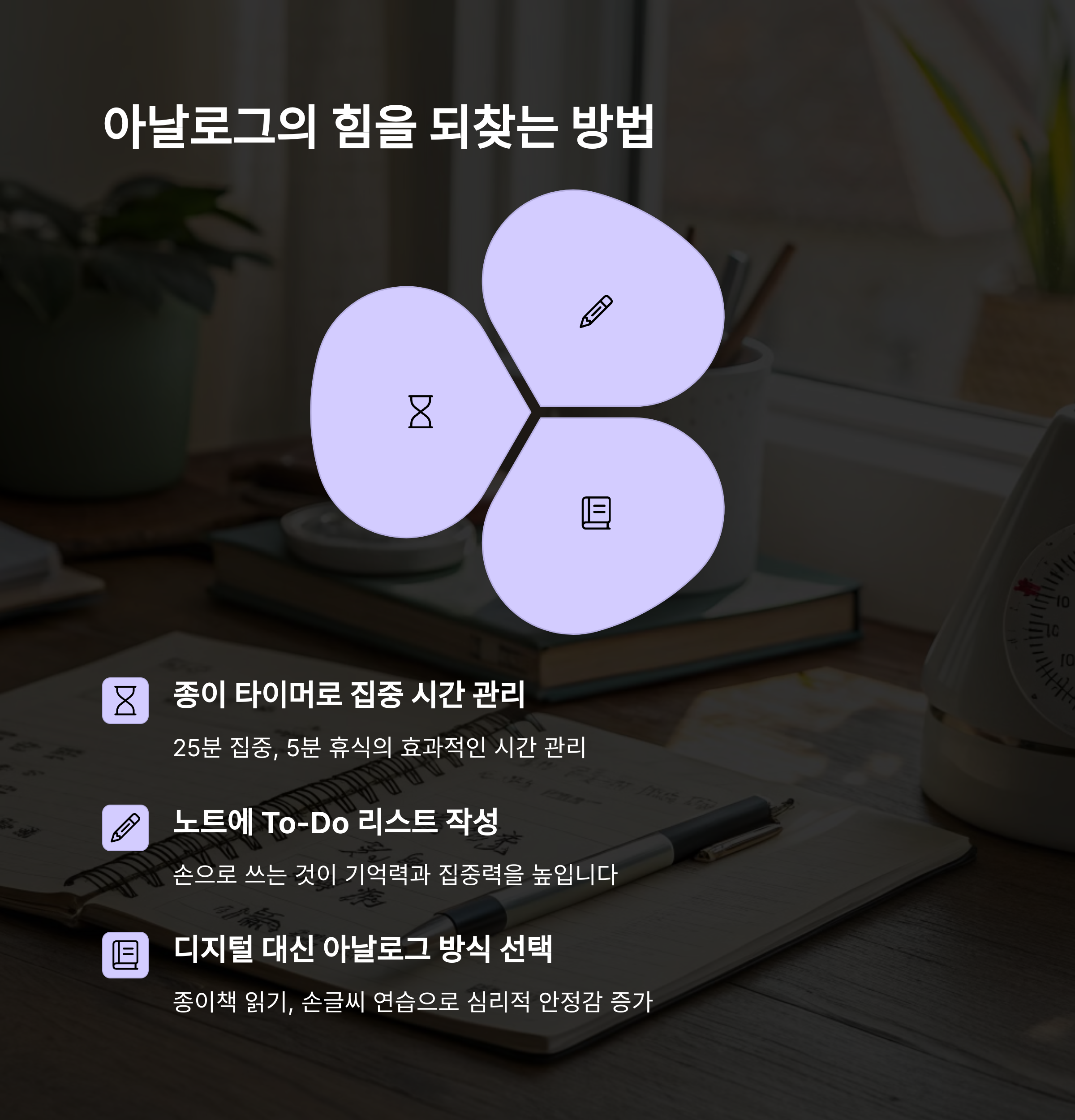 디지털 기기 대신 아날로그 도구를 활용해 보는 것도 큰 도움이 됩니다. 저는 아래 표처럼 주요 기기들을 아날로그로 대체했어요. 이 작은 변화가 하루의 질을 확 바꿔주더라고요.