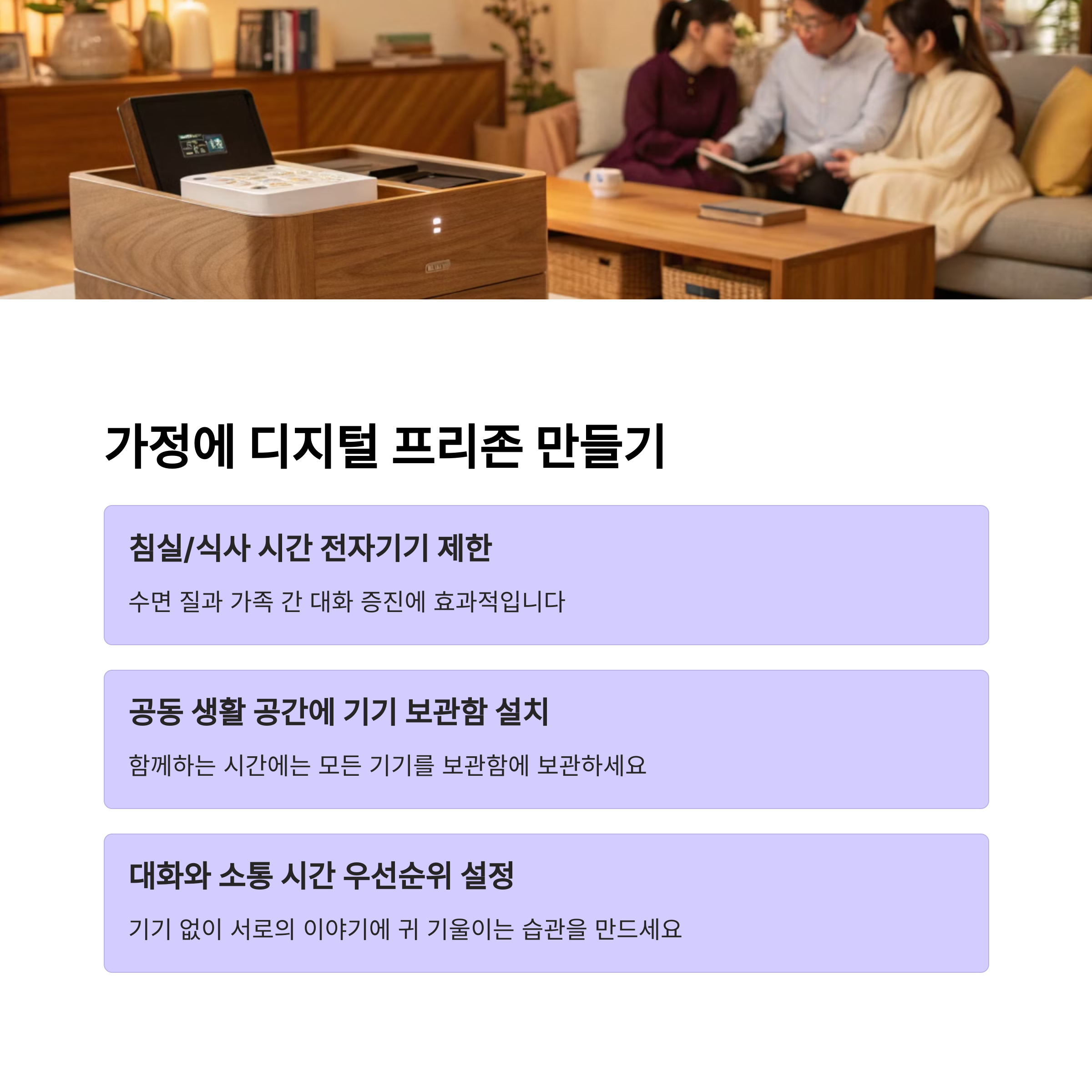 함께 디지털 프리존을 만들거나, 가족 책 읽는 시간을 정해 실천하면 자연스럽게 기기 사용이 줄어들어요.