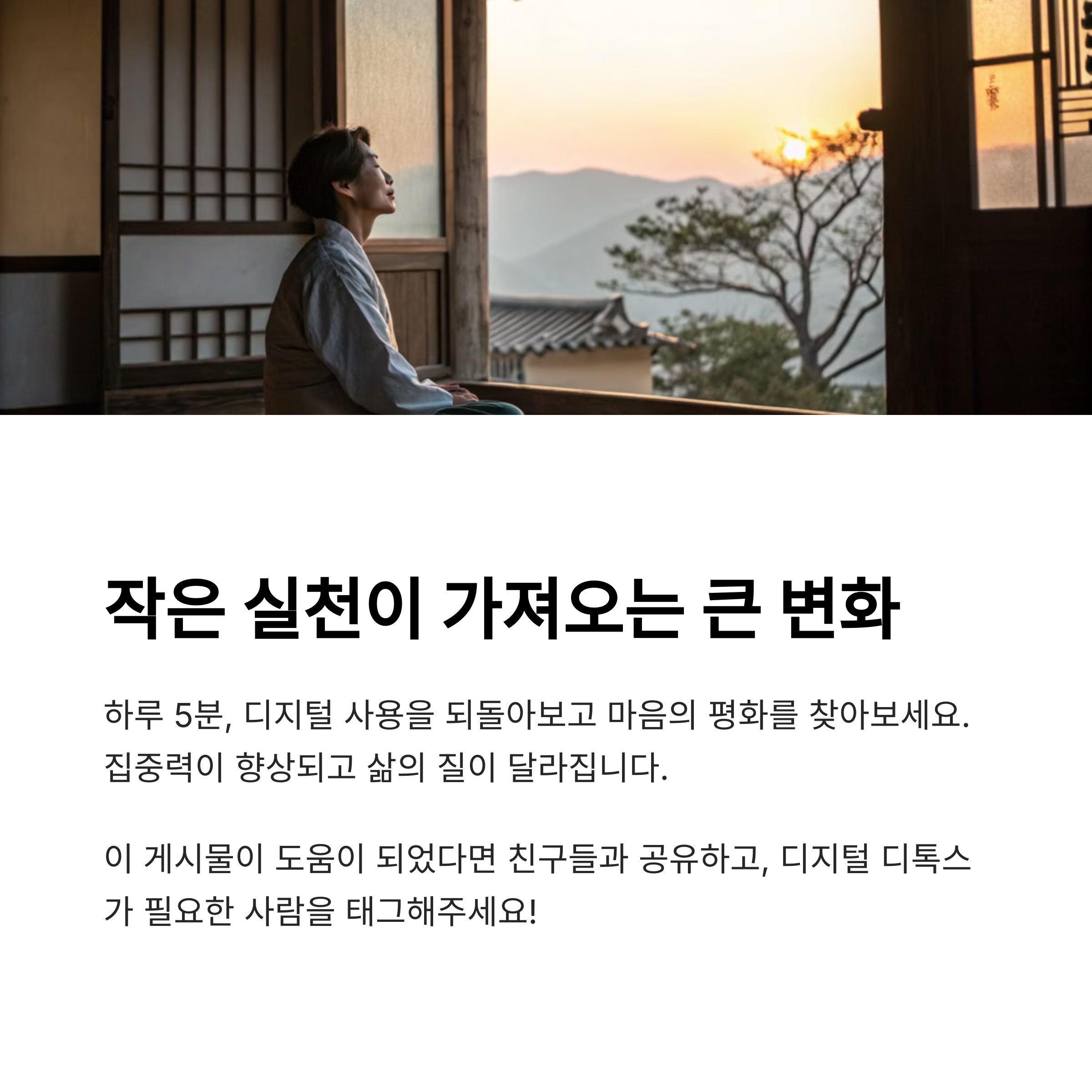 디지털 기기, 참 편리하죠. 하지만 그 편리함이 어느 순간부터 내 일상과 감정을 잡아먹고 있다면, 이제는 조금씩 놓아줄 때가 아닌가 싶어요. 저도 그렇게 조금씩, 아주 천천히 줄여왔고요. 완벽하지 않아도 괜찮아요. 오늘 하루, 10분만이라도 스마트폰 없이 걸어보세요. 세상이 조금 다르게 보일지도 몰라요. 여러분도 자신만의 디지털 디톡스를 시작해 보시겠어요? 댓글로 여러분의 경험이나 고민도 함께 나눠주세요. 우리, 함께 만들어가요.