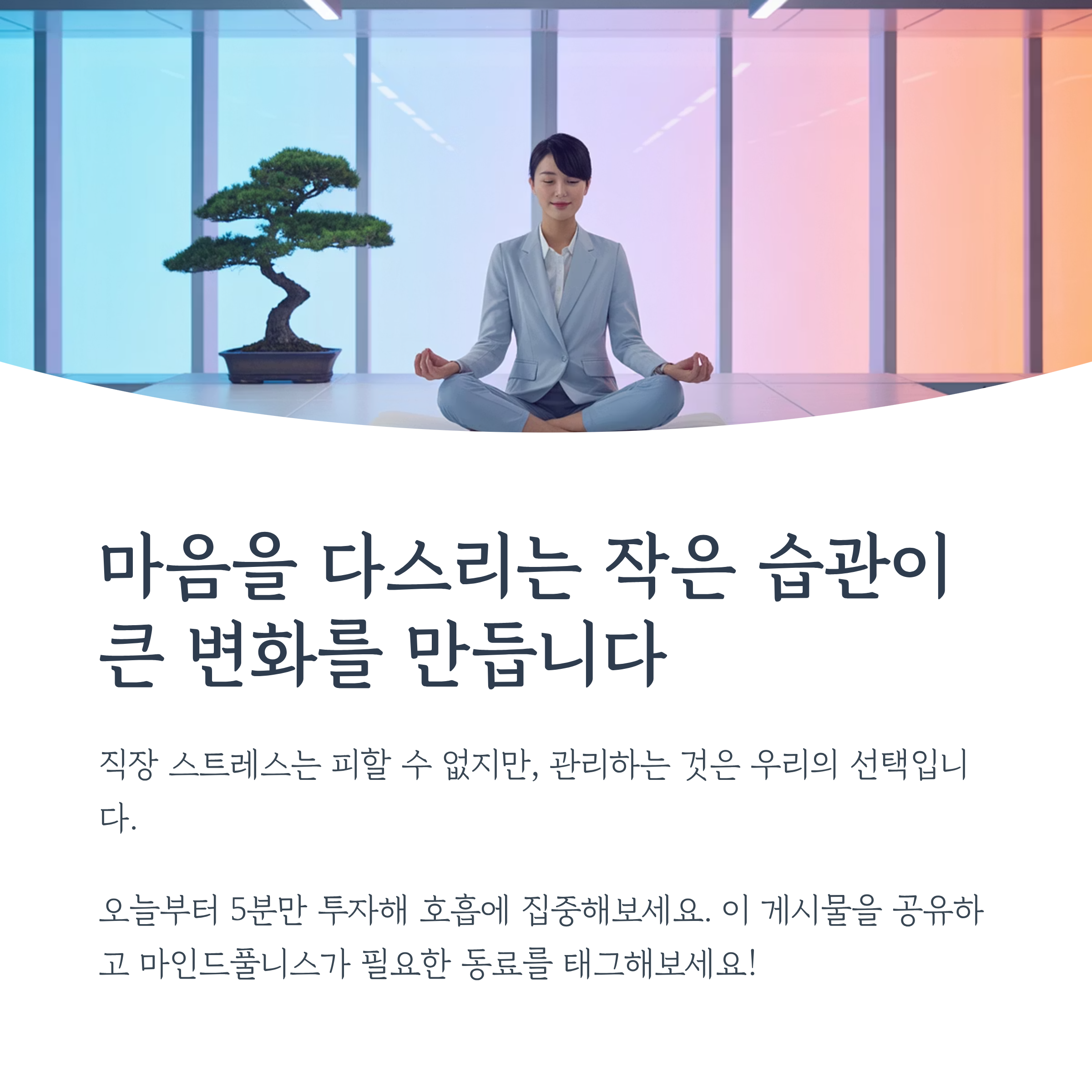 당장 오늘부터 5분만 투자해 호흡에 집중해 보세요. 작은 습관이 쌓여 마음에 평화를 가져오고, 다시 활기찬 직장생활을 할 수 있게 도와줄 것입니다.