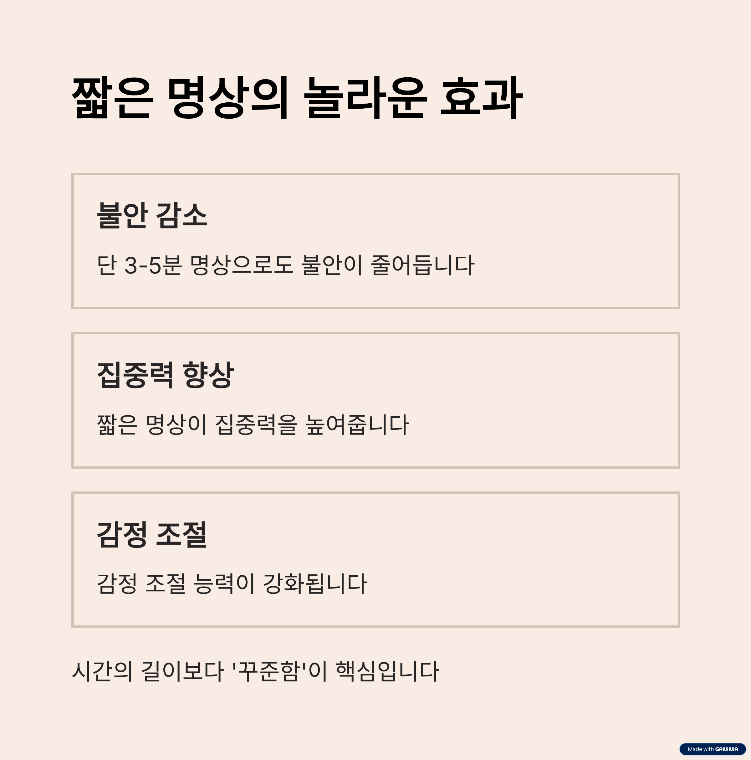 많은 사람들이 명상이라고 하면 긴 시간 동안 조용히 앉아 있어야 한다고 생각합니다. 하지만 현대인의 일상은 너무 바빠서 그렇게 긴 시간을 확보하기 어렵죠. 그렇다고 명상을 포기할 필요는 없습니다. 오히려 짧고 간단한 명상 루틴이 꾸준히 이어가기 더 적합합니다. 3분, 5분, 10분의 짧은 명상만으로도 불안이 줄고 집중력이 높아지며, 감정 조절 능력이 강화된다는 연구 결과도 있습니다. 즉, 명상은 시간의 길이가 아니라 ‘꾸준함’이 핵심입니다.