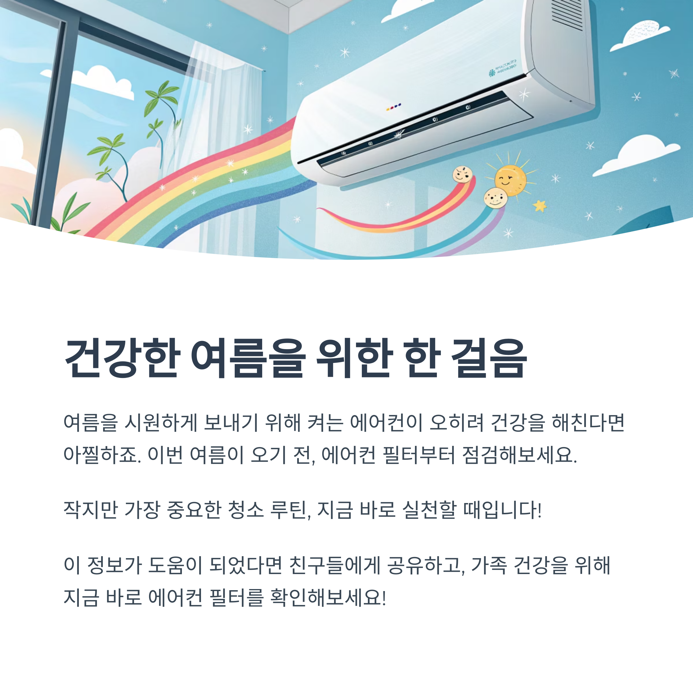 여름을 시원하게 보내기 위해 켜는 에어컨이, 오히려 건강을 해친다면? 생각만 해도 아찔하죠. 필터 청소는 번거롭지 않아요. 단 10분 투자로 가족 건강도 지키고, 전기요금도 줄일 수 있다면 매달 해야 할 이유는 충분합니다. 이번 여름이 오기 전, 에어컨 필터부터 점검해보세요. 작지만 가장 중요한 청소 루틴, 지금 바로 실천할 때입니다!
