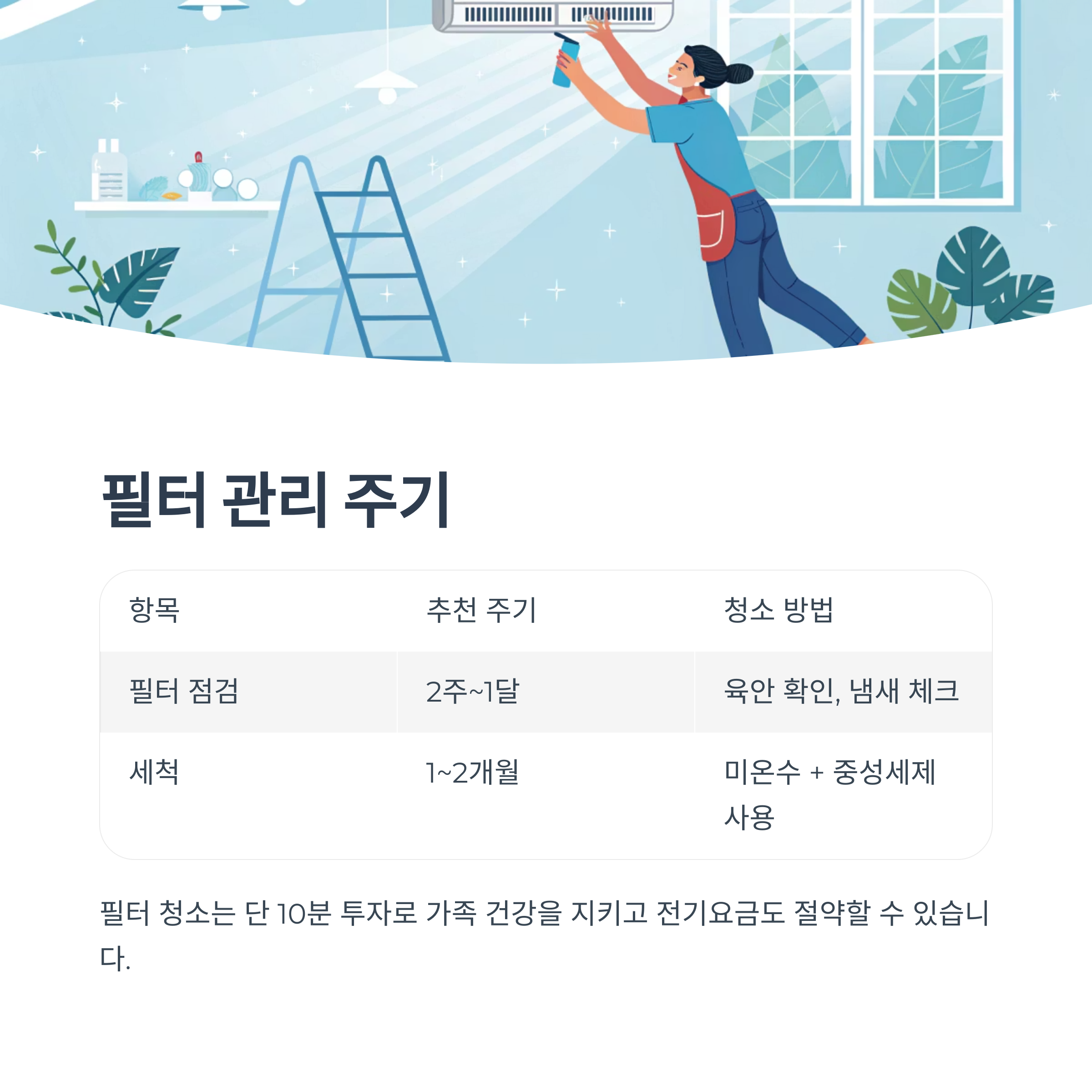 에어컨 필터는 생각보다 간단하게 청소할 수 있습니다. 일반 가정에서는 2주~1달에 한 번 점검하고, 1~2개월에 한 번 세척하는 것이 가장 좋습니다. 아래는 추천 점검 주기와 청소 팁을 정리한 표입니다.