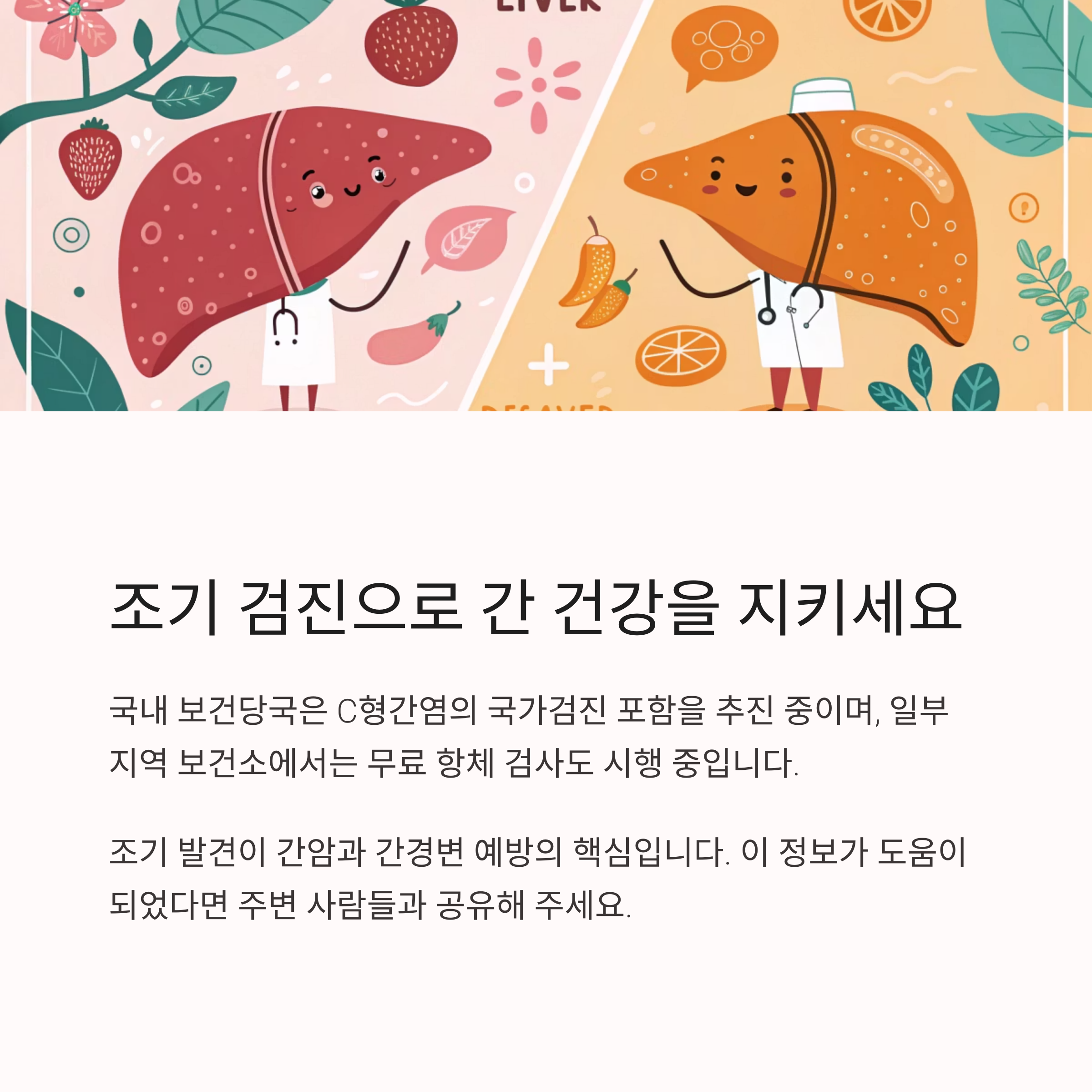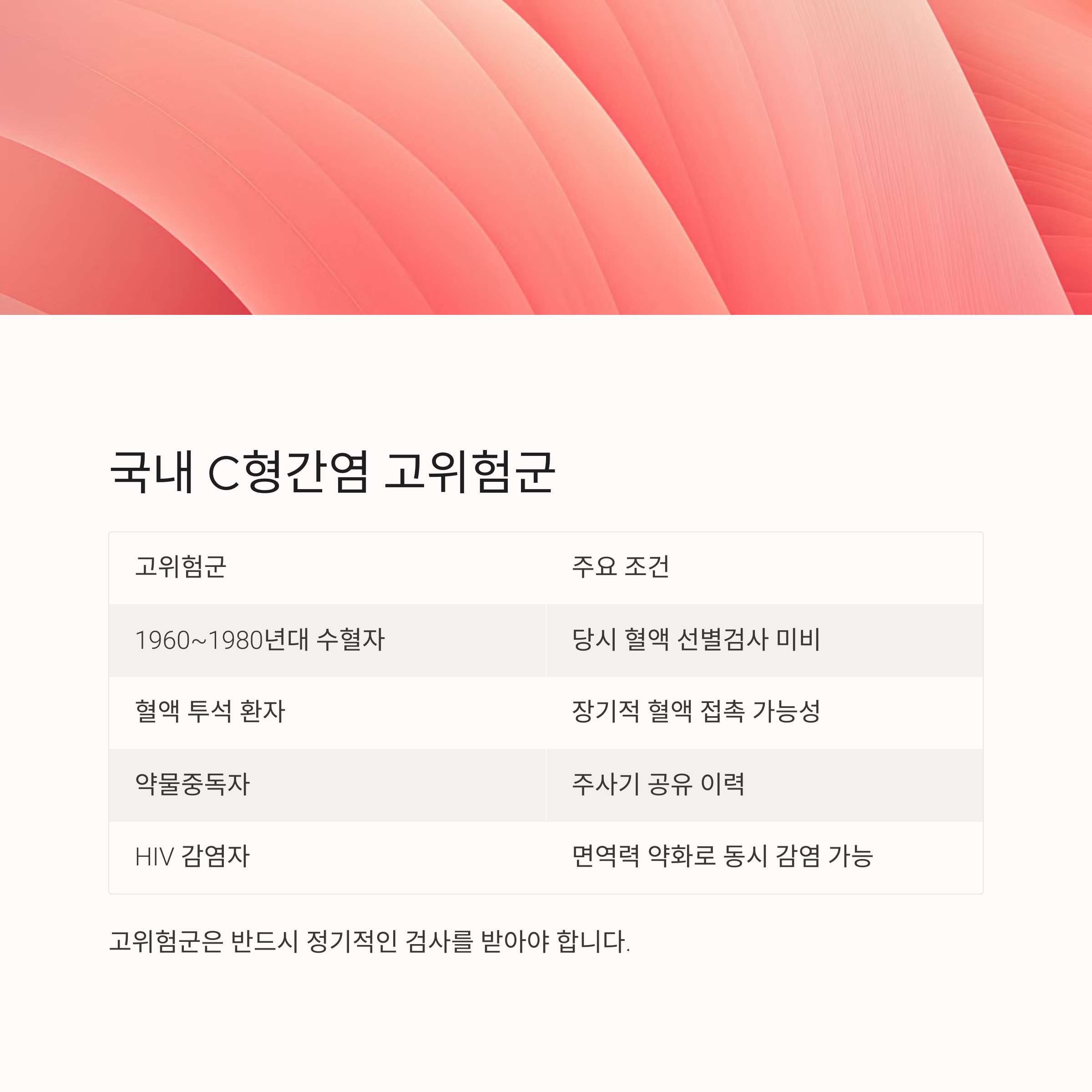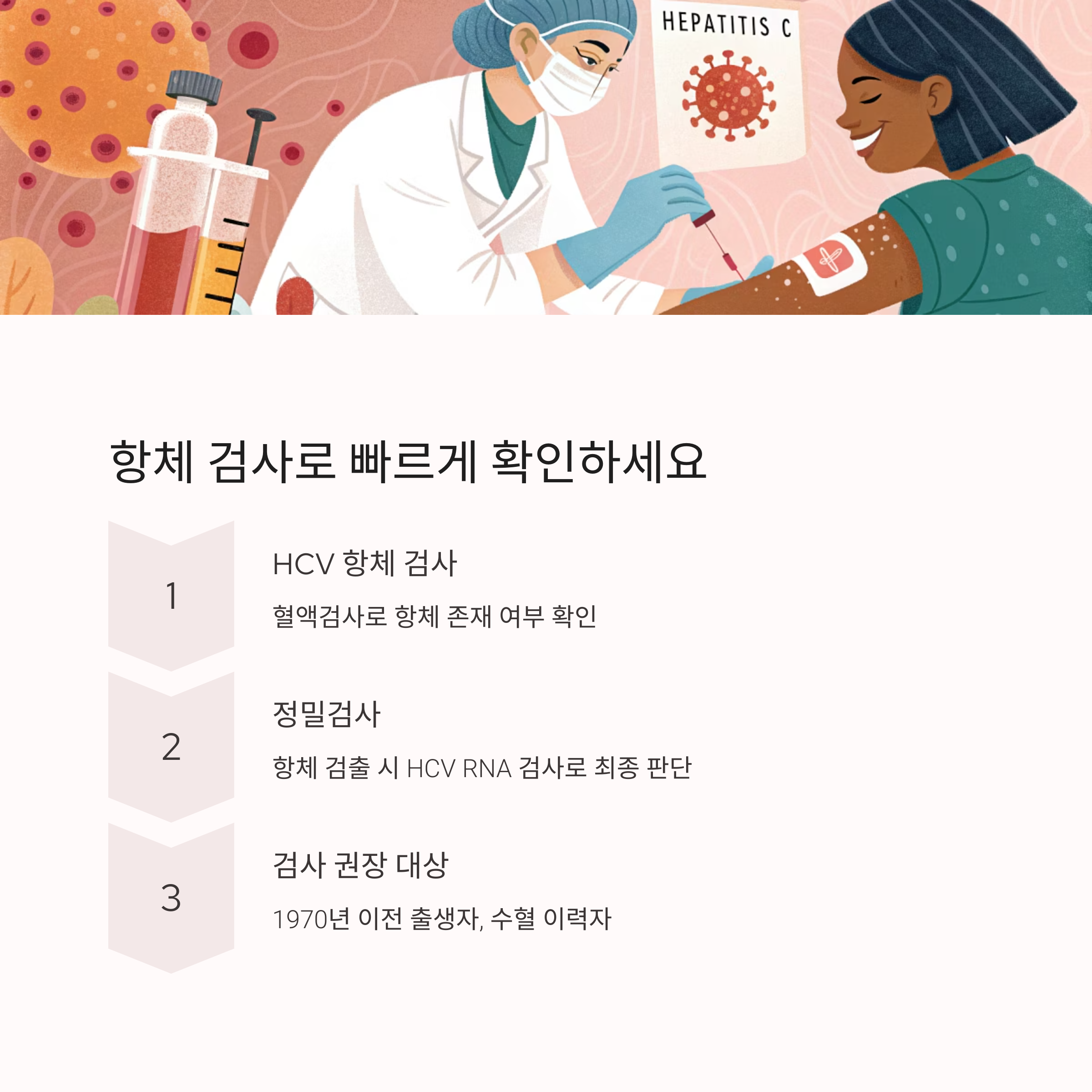 이 검사는 보건소나 병원에서 간편하게 받을 수 있으며, 특히 1970년 이전 출생자나 수혈 이력이 있는 경우 꼭 검사를 권장합니다.