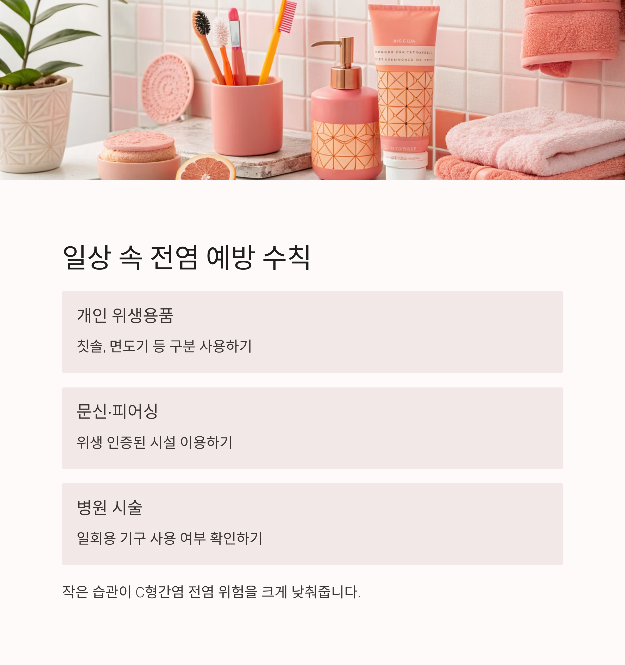 개인 위생용품 구분 사용, 문신·피어싱 시 위생 점검, 병원 시술 전 기구 상태 확인 등