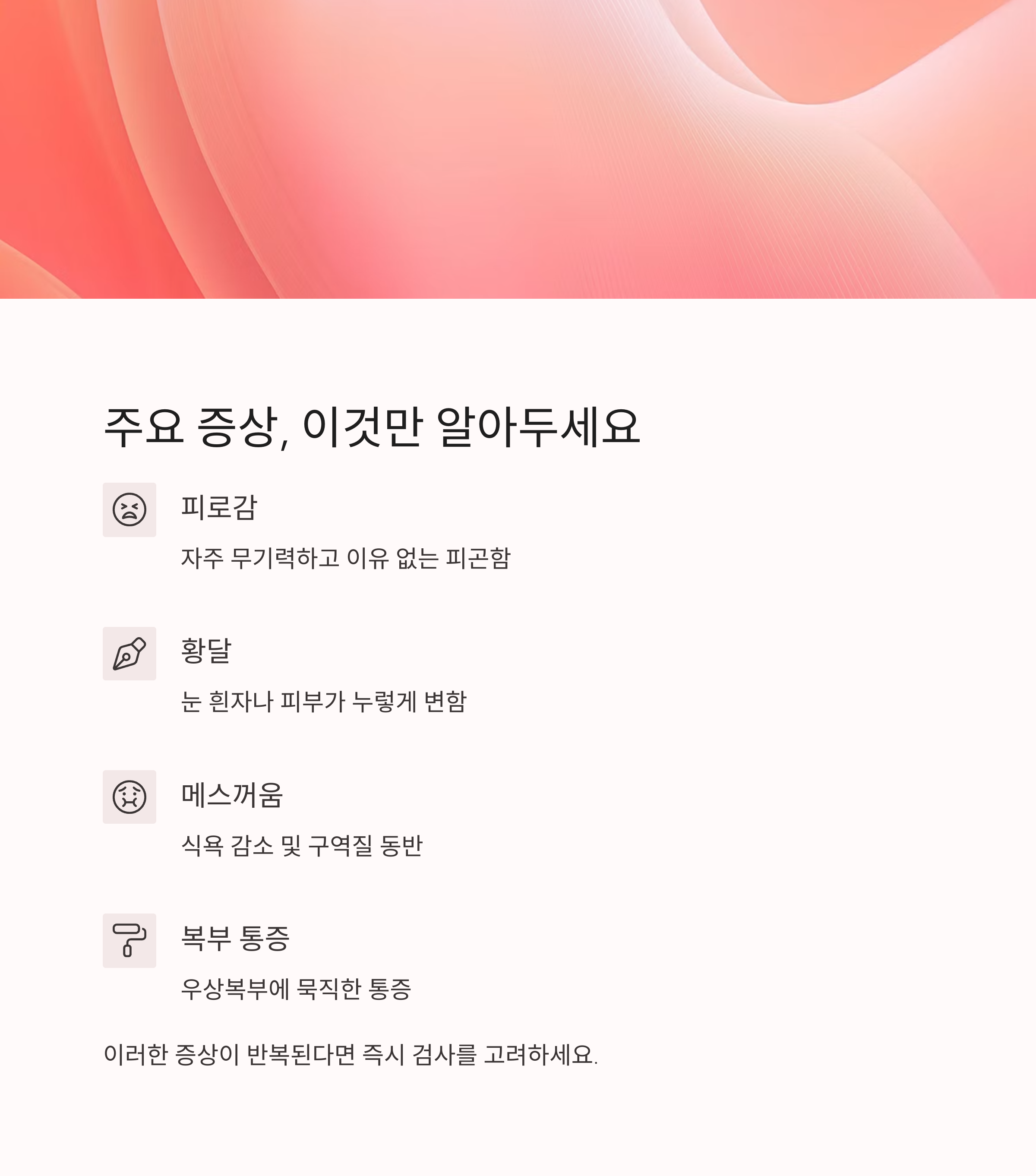 | 황달 | 눈 흰자나 피부가 누렇게 변함 |