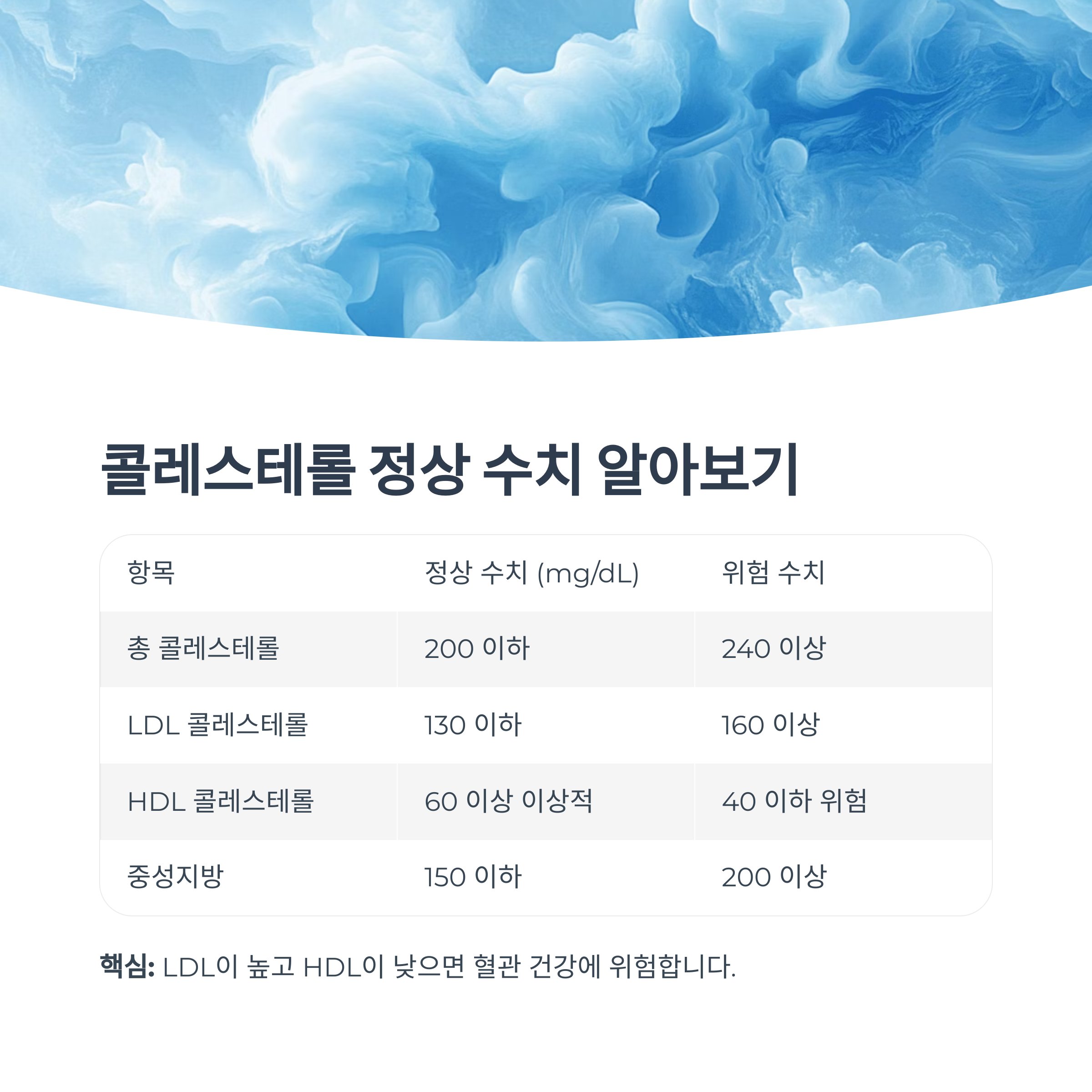 핵심: LDL이 높고 HDL이 낮으면 혈관 건강에 위험합니다.