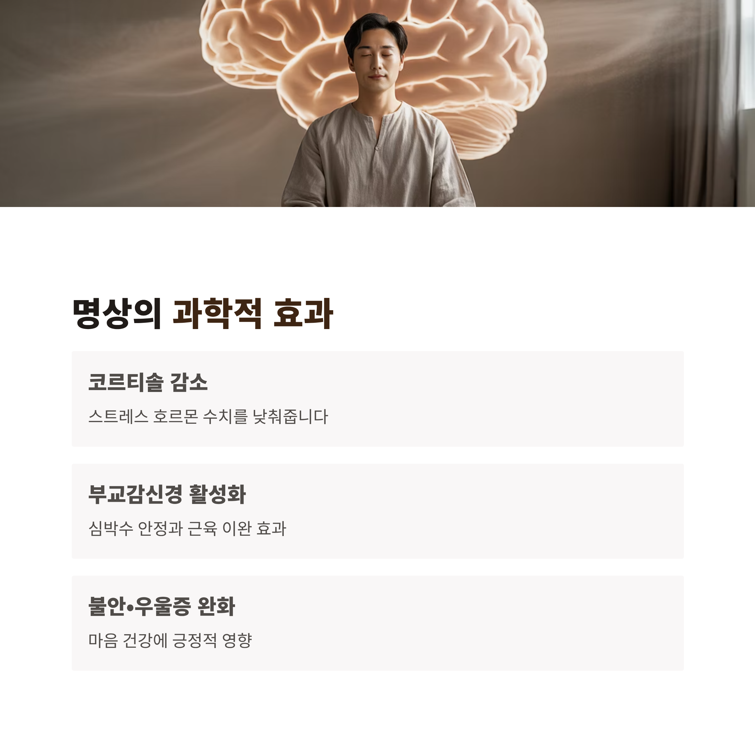 명상은 과학적으로 스트레스 호르몬인 코르티솔을 감소시키고, 뇌의 전두엽을 활성화시키는 효과가 있습니다. 이는 우리 뇌가 현재 순간에 집중하고 불필요한 잡생각에서 벗어나는 데 도움을 줍니다.