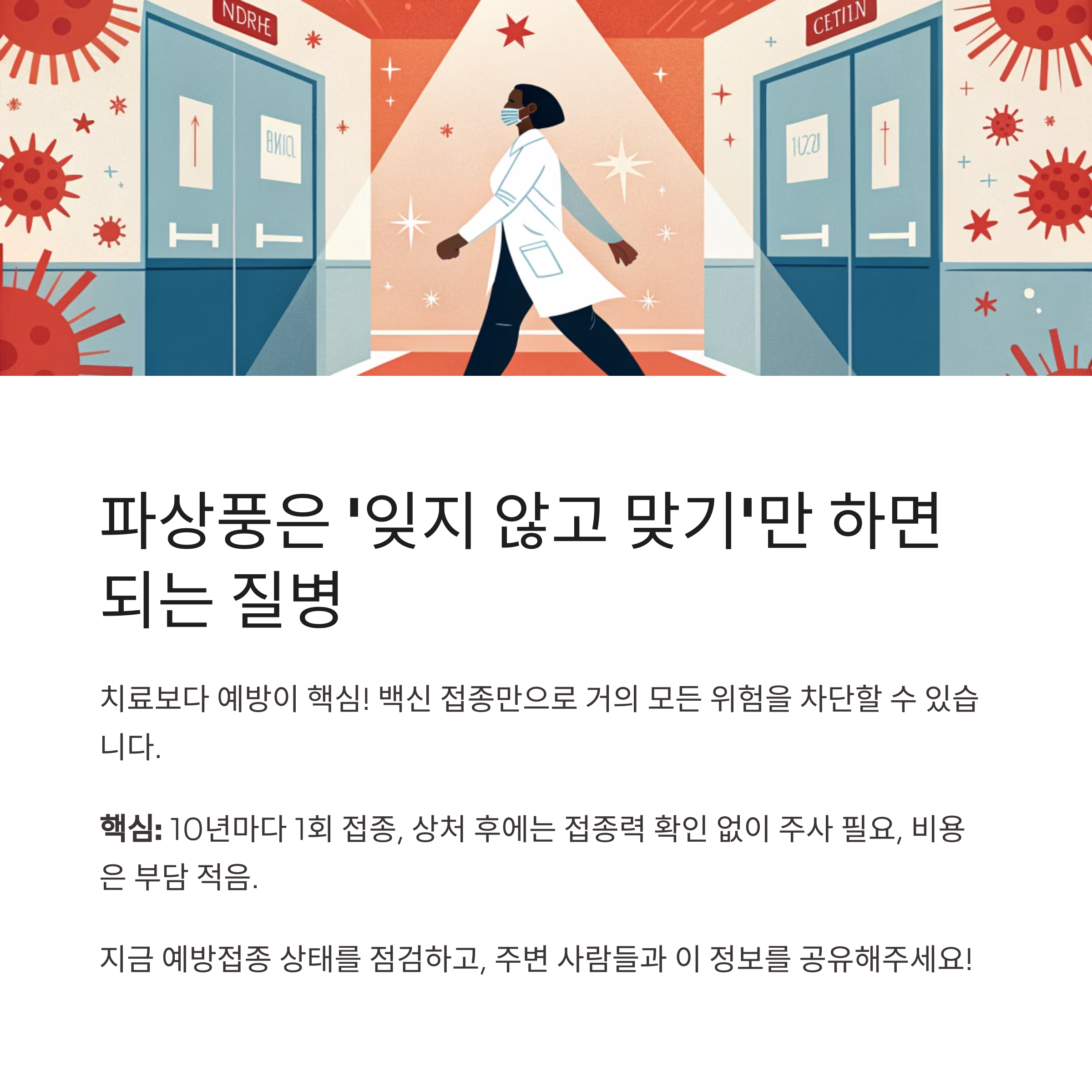 | 예방접종 한 번만 하면 되나요? | 아니요. 10년마다 반복 접종해야 면역 유지 |