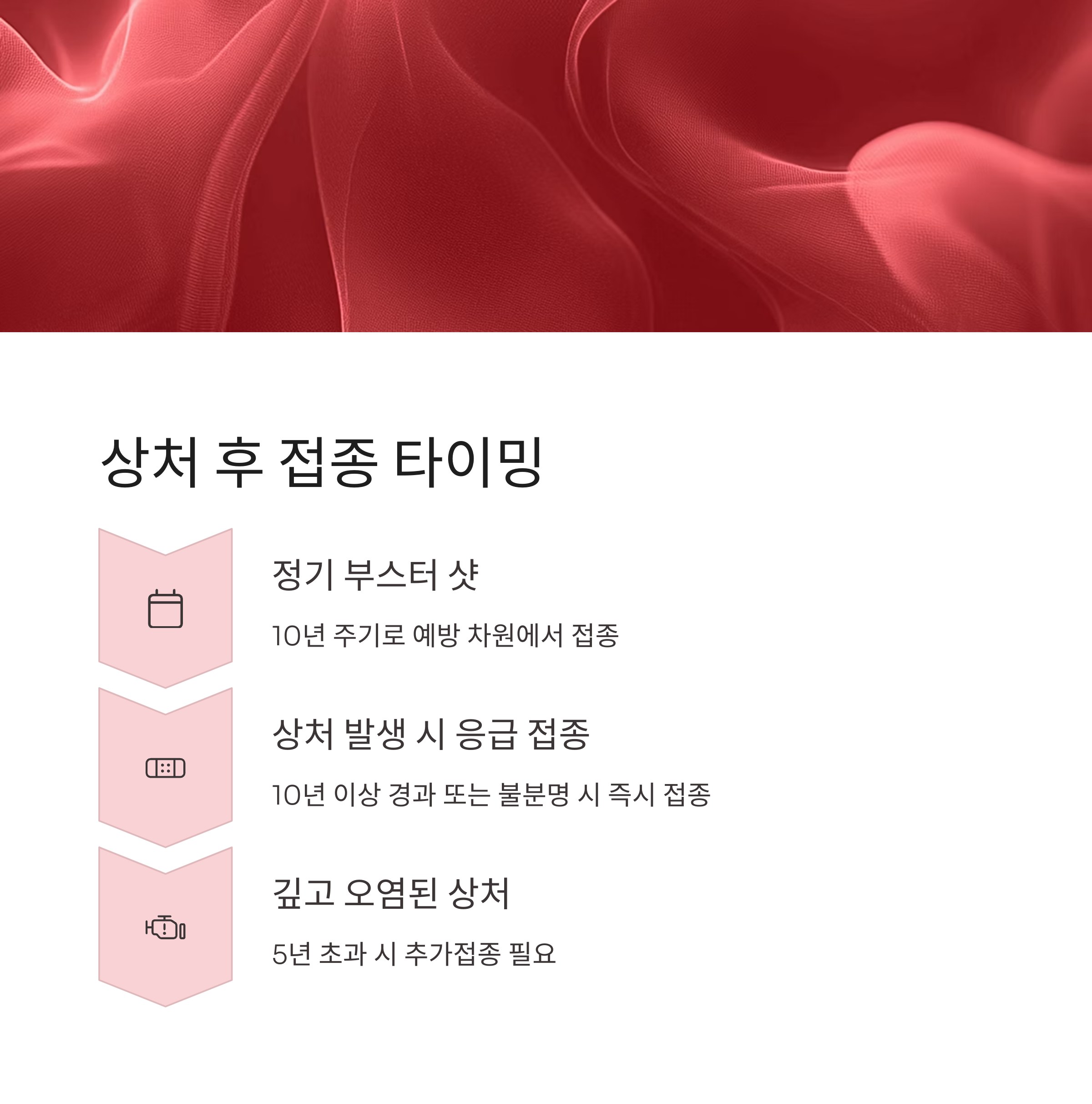 | 깊고 오염된 상처 | 5년 이내 접종이면 괜찮음, 5년 초과 시 추가접종 필요 |